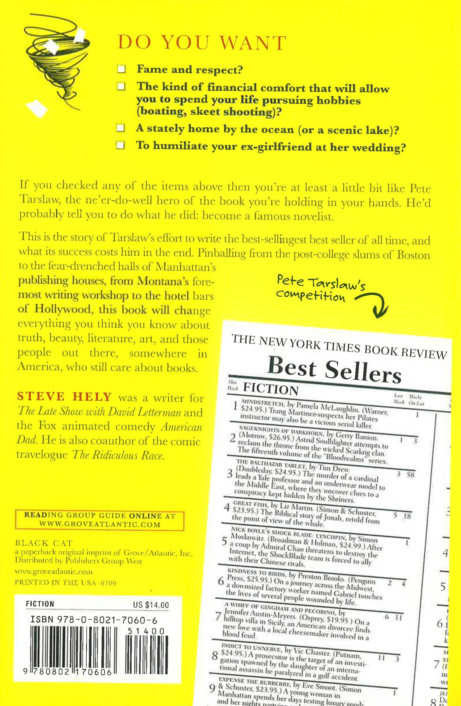 What Pete Tarslaw wants is simple enough: a realistic amount of fame that will open new avenues of sexual opportunity; the kind of financial comfort that will allow him to spend his life pursuing hobbies such as boating or skeet shooting at his stately home by the ocean or a scenic lake; andperhaps mostly importantlythe chance to humiliate his ex-girlfriend at her wedding. This is the story of how he succeeds in getting it all, and what it costs him in the end.