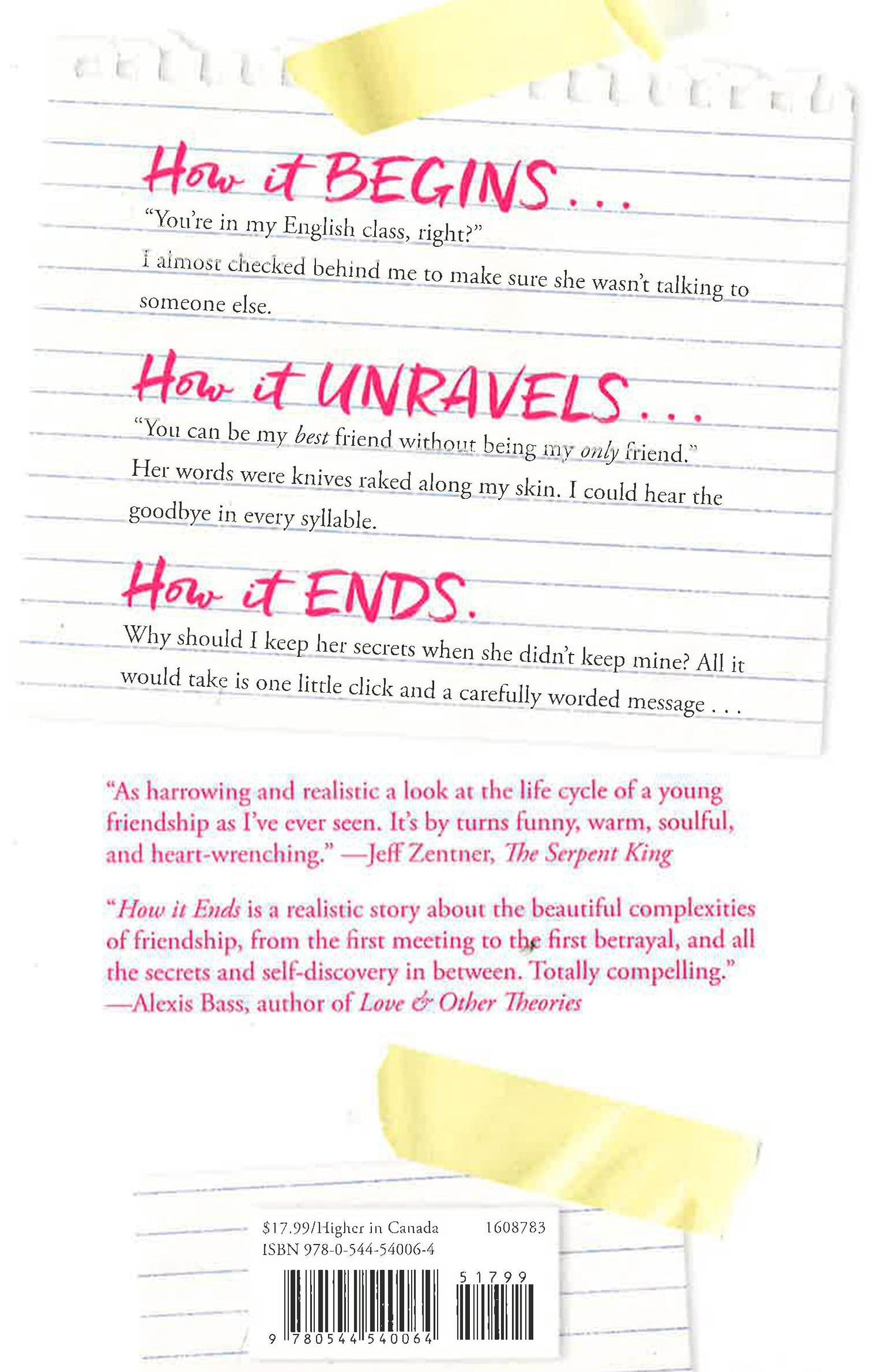 There are two sides to every story. It's friends-at-first-sight for Jessie and Annie, proving the old adage that opposites attract. Shy, anxious Jessie would give anything to have Annie's beauty and confidence. And Annie thinks Jessie has the perfect life, with her close-knit family and killer grades. They're BFFs ...until suddenly they're not. Told through alternating points of view, How It Ends is the story of a friendship from first meeting to breakup, set against a tumultuous sophomore year of bullying, boys, and backstabbing.