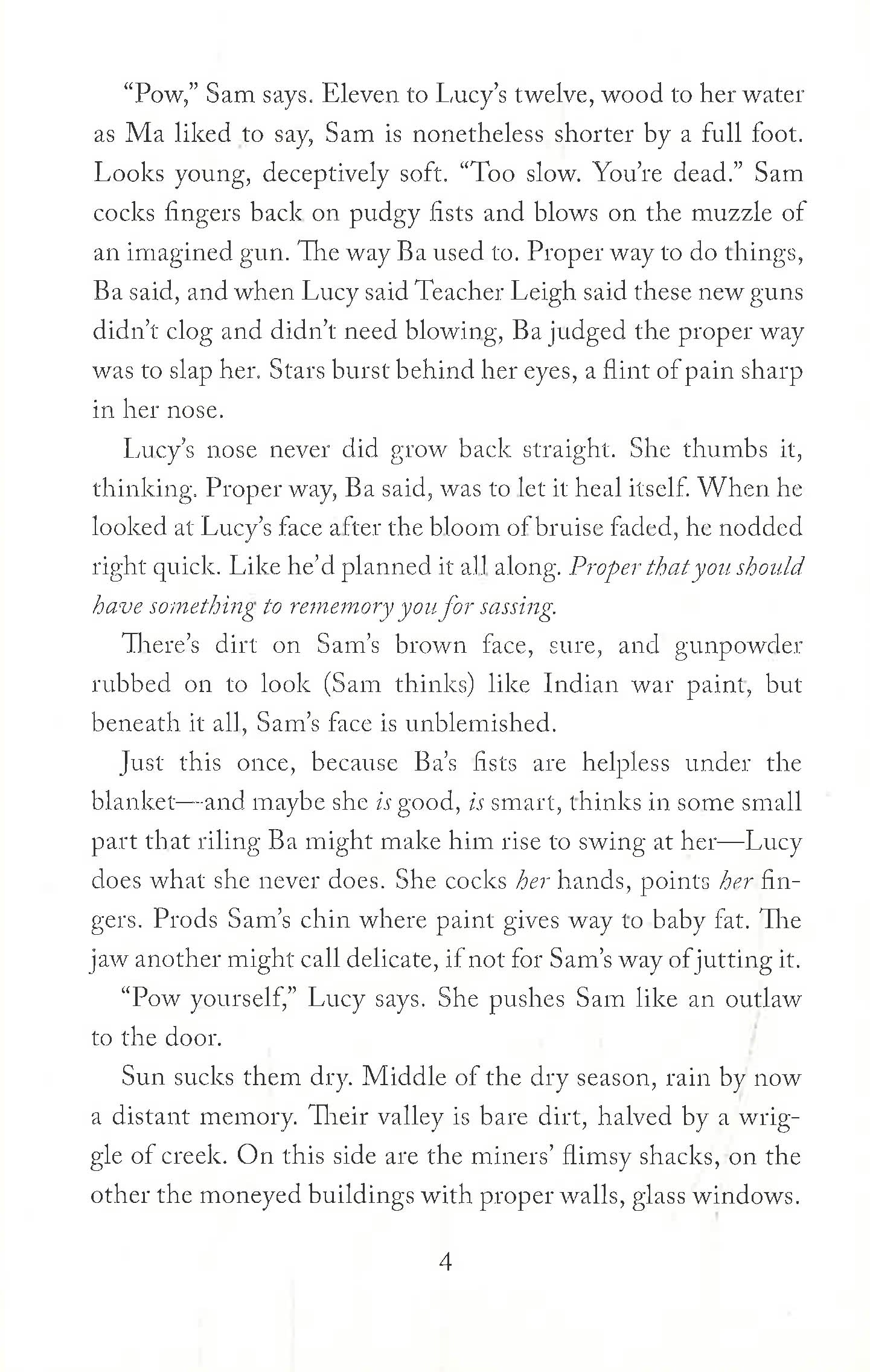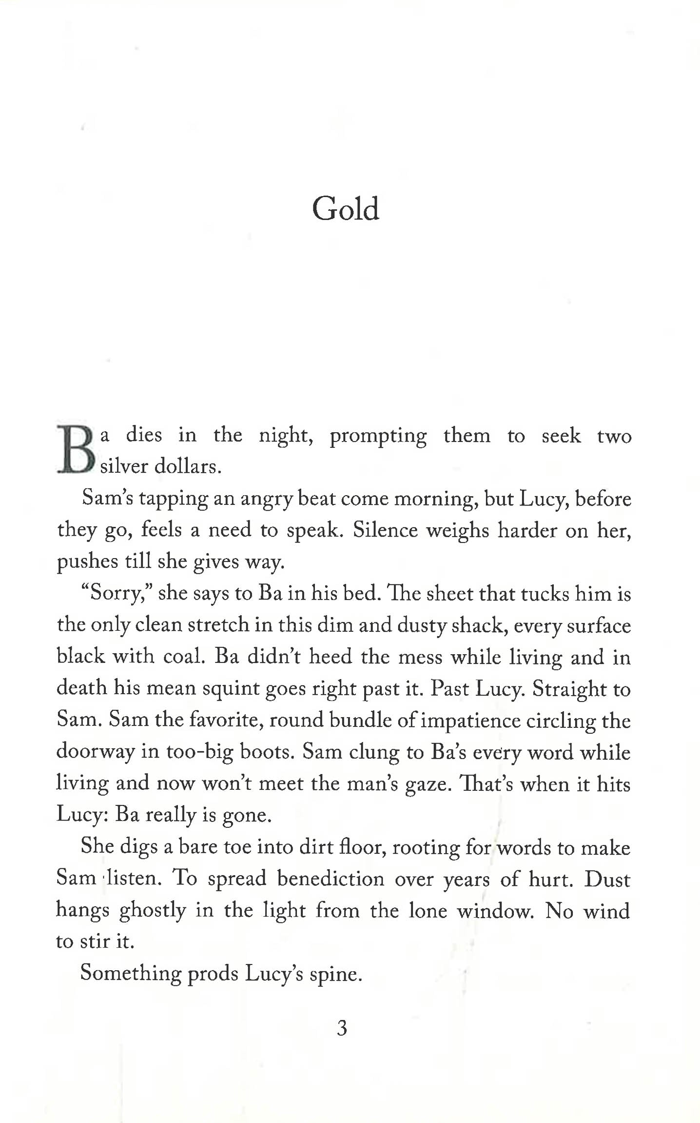 Ba dies in the night, Ma is already gone. Lucy and Sam, twelve and eleven, are suddenly alone and on the run. With their father's body on their backs, they roam an unforgiving landscape dotted with giant buffalo bones and tiger paw prints, searching for a place to give him a proper burial.