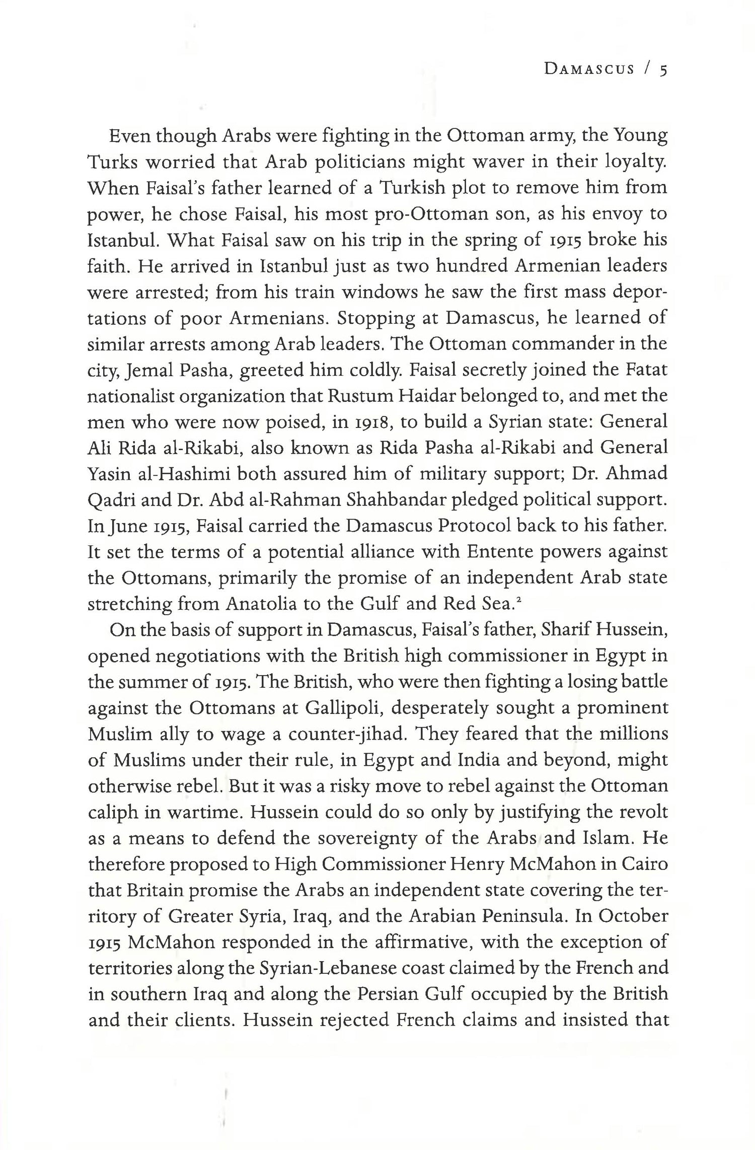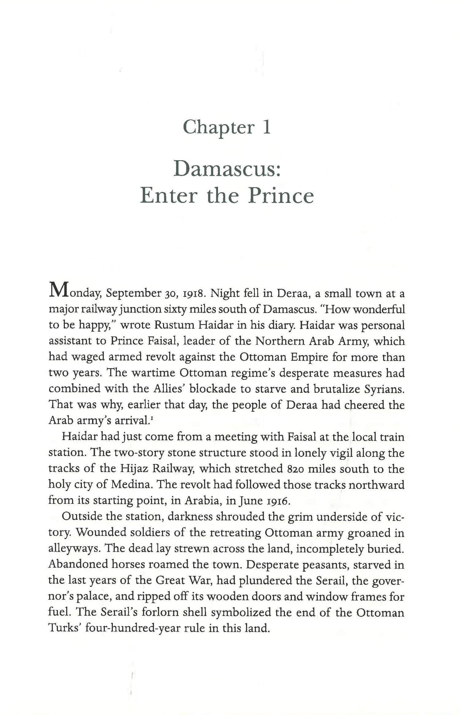 When Europe's Great War engulfed the Ottoman Empire, Arab nationalists rose in revolt against their Turkish rulers and allied with the British on the promise of an independent Arab state. In October 1918, the Arabs' military leader, Prince Faisal, victoriously entered Damascus and proclaimed a constitutional government in an independent Greater Syria.