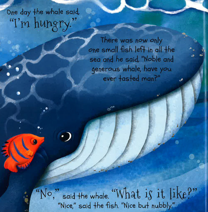 In the ocean, a whale ate all the fish except a tiny one, which was very clever. For fear of being eaten, this tiny fish advised the whale to eat humans. Hungry, the whale went in search of a man and swallowed a shipwrecked sailor. But he began to dance, to jump, to leap into the belly of the whale. When the whale could not stand it any longer, she asked him to get out. The sailor accepted provided that the whale brings him home.The whale, in turn accepted, without suspecting that agreement would forever change the lives of whales.