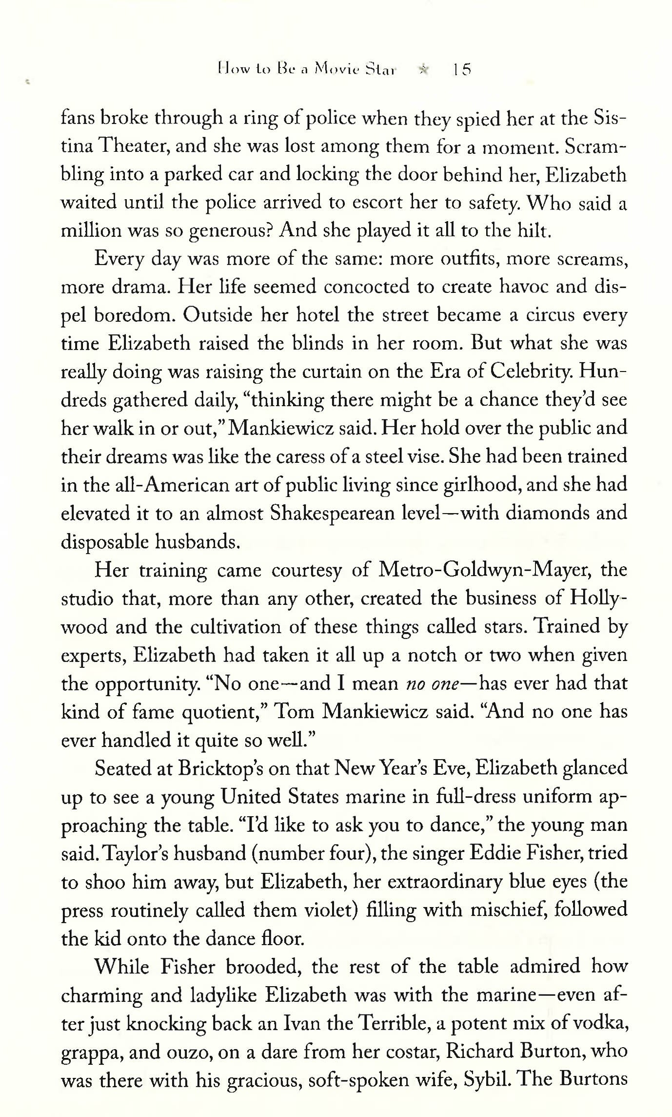 From her days as a youthful minx at Metro-Goldwyn-Mayer to her post-studio reign as America's lustiest middle-aged movie queen, Taylor has defined the very essence of Hollywood stardom. Marching through the decades swathed in mink, discarding husbands nearly as frequently as she changed her diamond necklaces, Taylor dominated the headlines as no other star before or since. From America's sweetheart to America's homewrecker and then back again, she uncannily reflected (and at times predicted) the always shifting cultural zeitgeist. How to Be a Movie Star is a different kind of book about Elizabeth Taylor: an intimate look at a girl who grew up with fame, who learned early - and well - how to be famous.