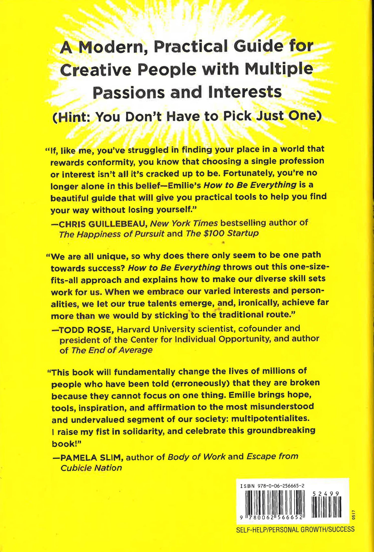 What do you want to be when you grow up? It's a familiar question we're all asked as kids. While seemingly harmless, the question has unintended consequences. It can make you feel like you need to choose one job, one passion, one thing to be about. Guess what? You don't. Having a lot of different interests, projects and curiosities doesn't make you a "jack-of-all-trades, master of none." Your endless curiosity doesn't mean you are broken or flaky. What you are is a multipotentialite: someone with many interests and creative pursuits. And that is actually your biggest strength. How to Be Everything helps you channel your diverse passions and skills to work for you. Based on her popular TED talk, "Why some of us don't have one true calling", Emilie Wapnick flips the script on conventional career advice. Instead of suggesting that you specialize, choose a niche or accumulate 10,000 hours of practice in a single area, Wapnick provides a practical framework for building a sustainable life around ALL of your passions. You'll discover: * Why your multipotentiality is your biggest strength, especially in today's uncertain job market. * How to make a living and structure your work if you have many skills and interests. * How to focus on multiple projects and make progress on all of them. * How to handle common insecurities such as the fear of not being the best, the guilt associated with losing interest in something you used to love and the challenge of explaining "what you do" to others. Not fitting neatly into a box can be a beautiful thing. How to Be Everything teaches you how to design a life, at any age and stage of your career, that allows you to be fully you, and find the kind of work you'll love.*This Book May Have Remainder Mark*