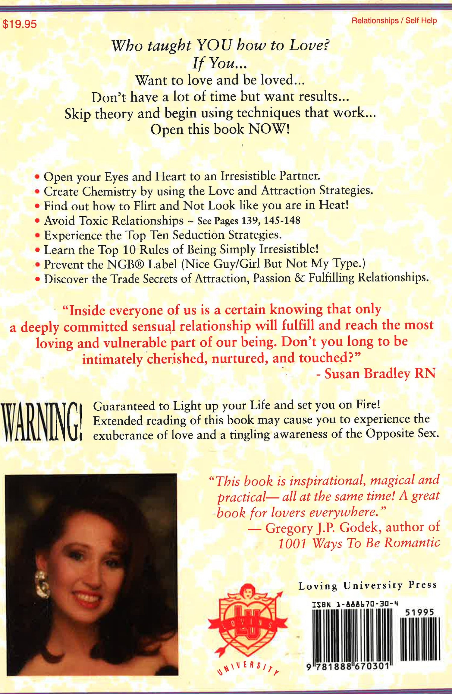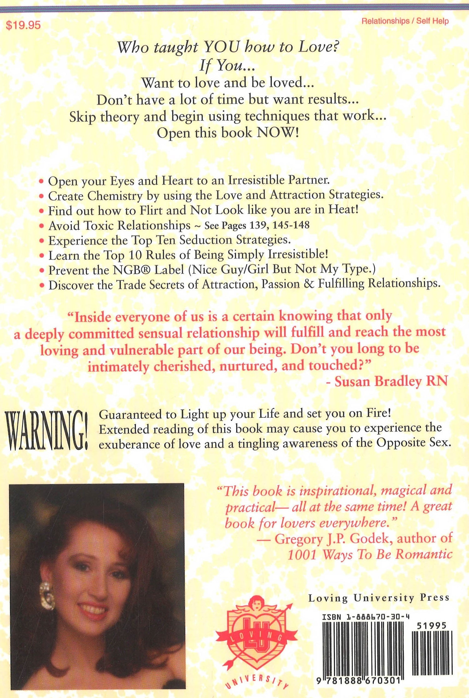 Readers can learn the Trade Secrets of Attraction, Passion, and Fulfilling Relationships with this inspiring, humorous self-help book by Susan Bradley, R.F.H. (Relationship Faithhealer). Topics include how to flirt without looking like you're in heat, the top ten worst things to say to a man, ways to tell if you're compatible, and more. Seminar & lecture tours.