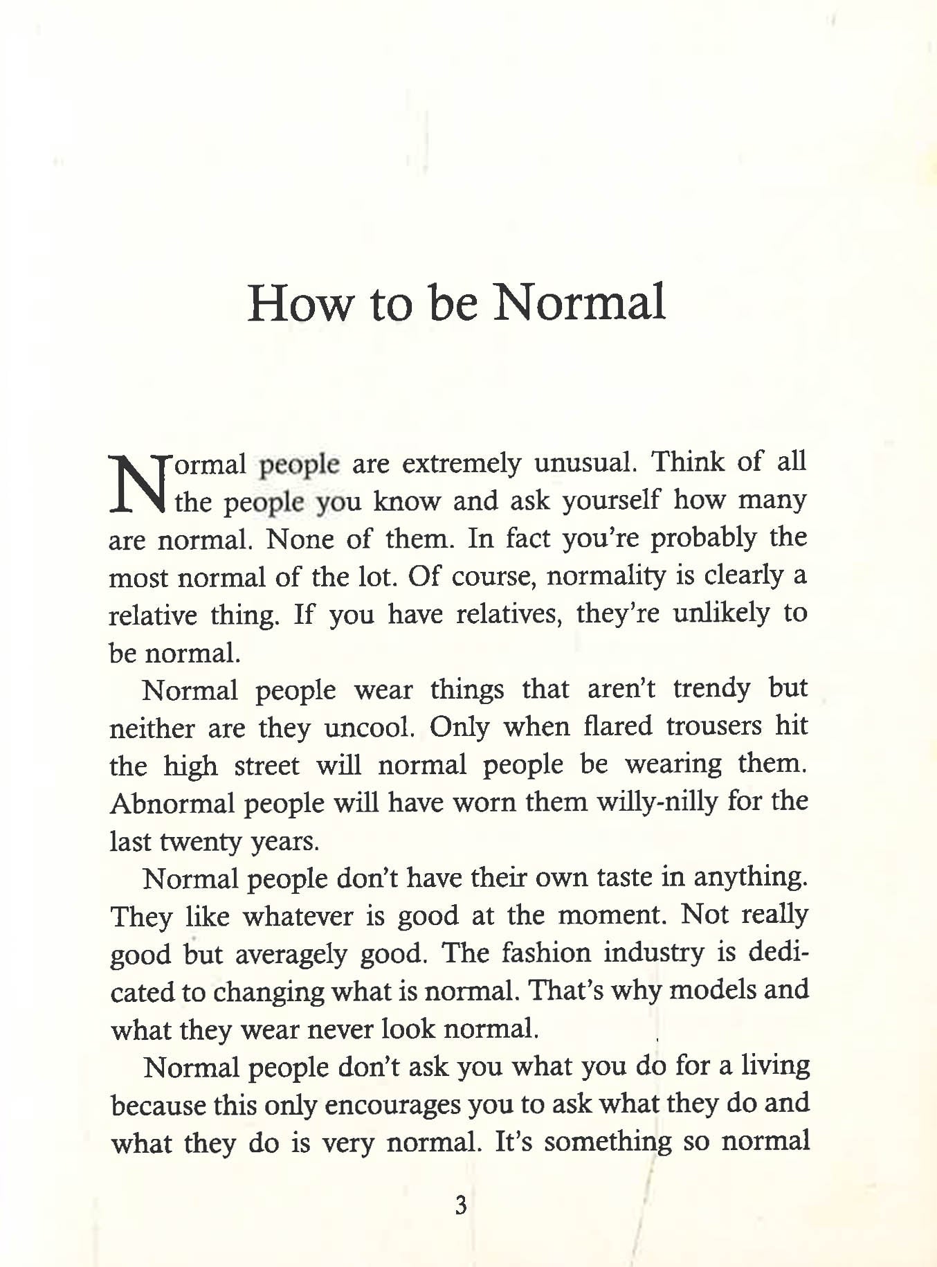 Normal people are extremely unusual. Think of all the people you know and ask yourself how many are normal. None of them! In fact you're probably the most normal of the lot and, let's face it, even you're not that normal.