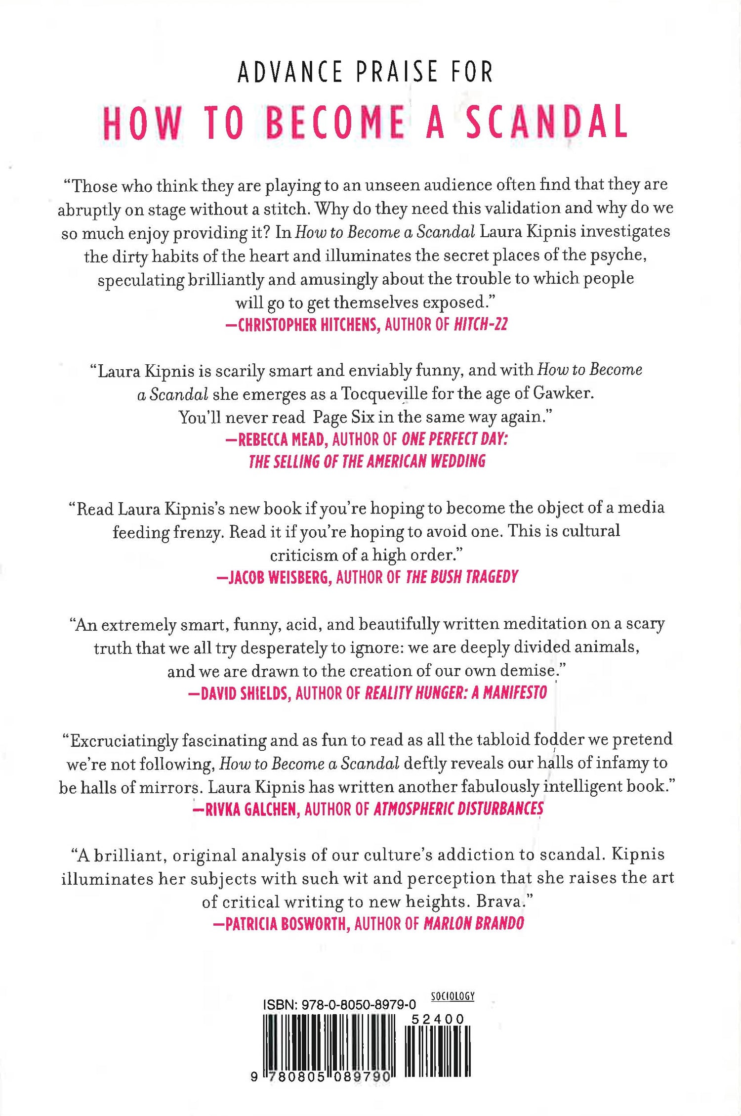 We all relish a good scandal - the larger the figure (governor, judge) and more shocking the particulars (diapers, cigars) - the better. But why do people feel compelled to act out their tangled psychodramas on the national stage, and why do we so enjoy watching them, hurling our condemnations while savoring every lurid detail? With "pointed daggers of prose" (The New Yorker), Laura Kipnis examines contemporary downfall sagas to lay bare the American psyche: what we desire, what we punish, and what we disavow. She delivers virtuoso analyses of four paradigmatic cases: a lovelorn astronaut, an unhinged judge, a venomous whistleblower, and an over-imaginative memoirist. The motifs are classic - revenge, betrayal, ambition, madness - though the pitfalls are ones we all negotiate daily. After all, every one of us is a potential scandal in the making: failed self-knowledge and colossal self-deception - the necessary ingredients - are our collective plight. In How to Become a Scandal, bad behavior is the entry point for a brilliant cultural romp as well as an anti-civics lesson. "Shove your rules," says scandal, and no doubt every upright citizen, deep within, cheers the transgression - as long as it's someone else's head on the block.