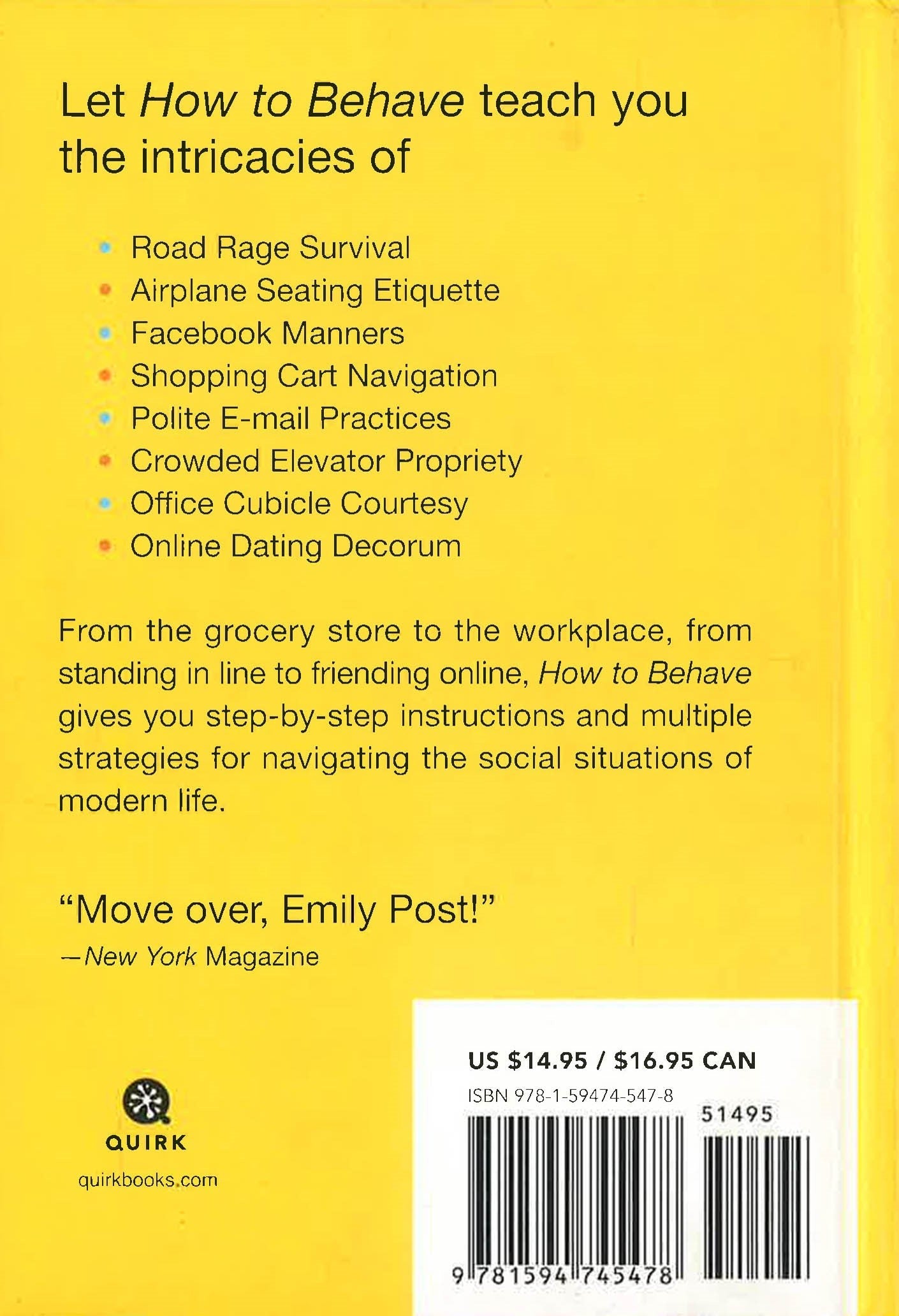 Is there any polite way to shush a chatty person at the movies? Should roller bladers be passed on the left side or the right side? When is it unacceptable to answer your cell phone? And why doesn't anyone in your grocery store seem to understand the basic rules of shopping cart navigation and right-of-way? If you've ever pondered these kinds of questions, "How to Behave" is the book you've been waiting for: a hip, irreverent, but entirely practical guide to proper behavior in the twenty-first century. Here are dozens of fascinating skills that Emily Post wouldn't even think to mention like the best ways to: Share elbow space on an airplane armrest. Contend with road rage. Position yourself when boarding a crowded elevator. Observe basic e-mail etiquette. Speak on a cell phone without enraging others...plus dozens of other essential survival techniques. Much more than a simple etiquette book, "How to Behave" is a real-life guide to living in the real world.