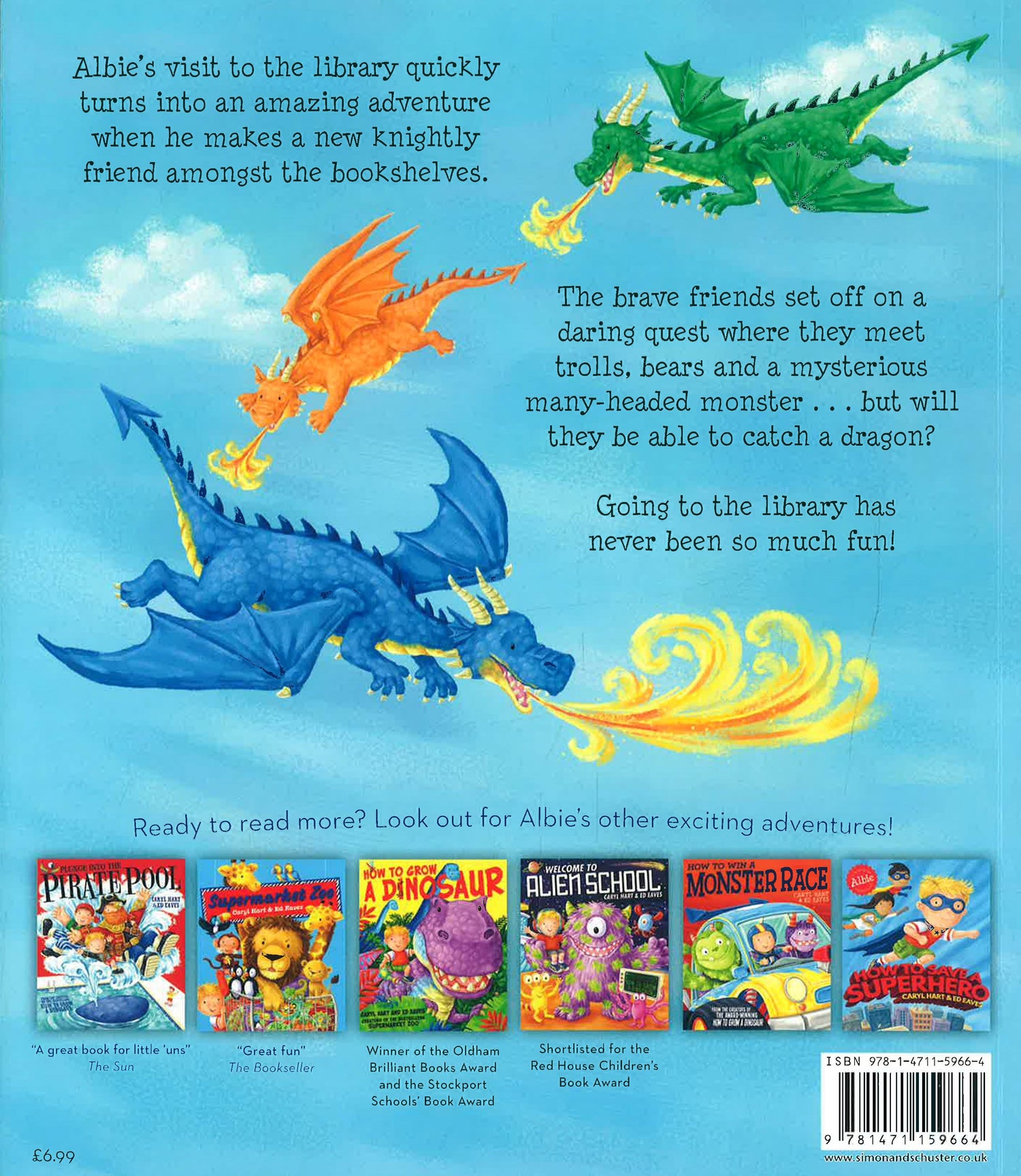 Albie's trip to the library soon turns into a fun adventure with his new knightly friend. On their way to find some dragons they meet trolls, bears and a mysterious many-headed monster. Going to the library has never been so much fun!