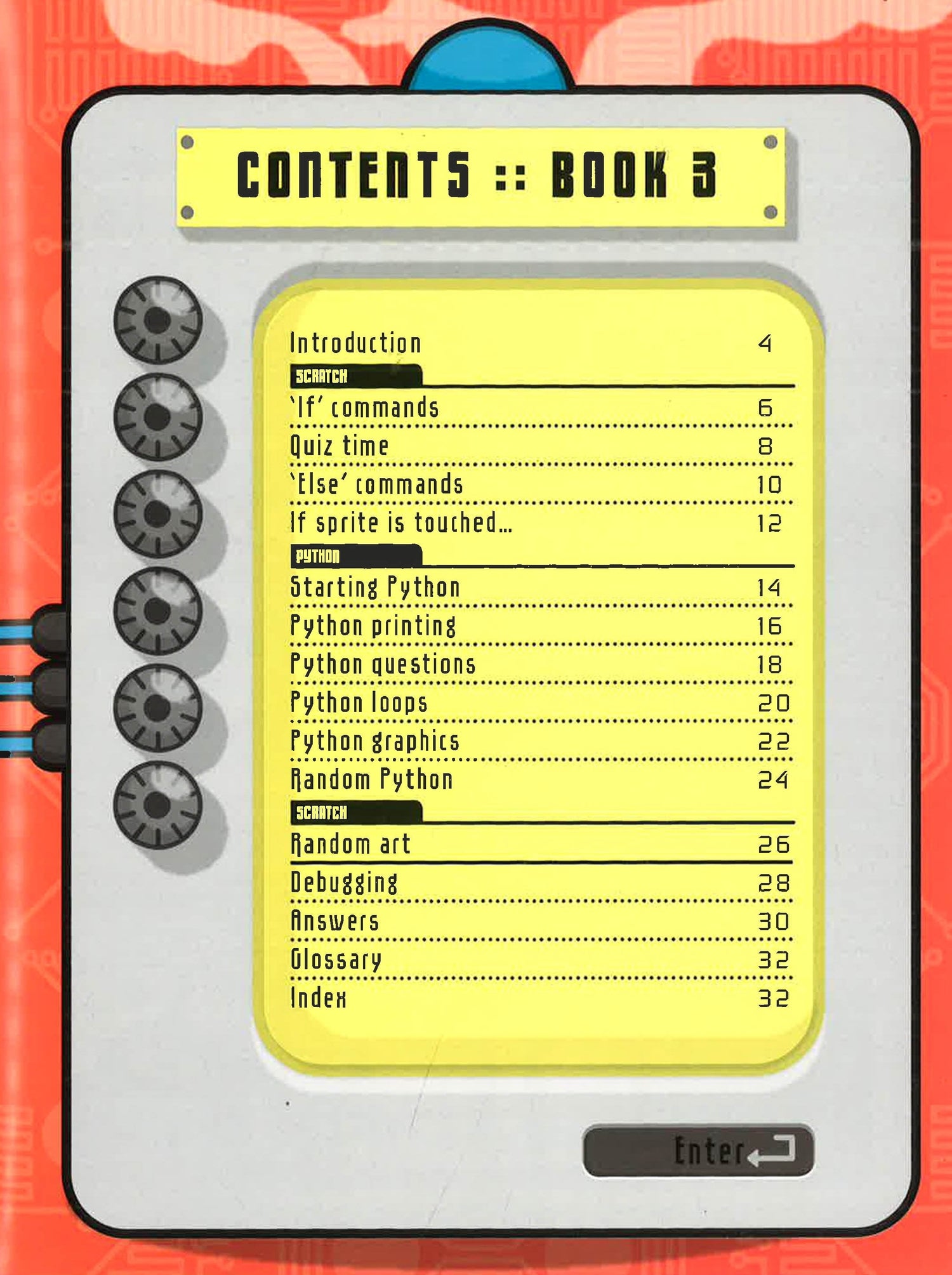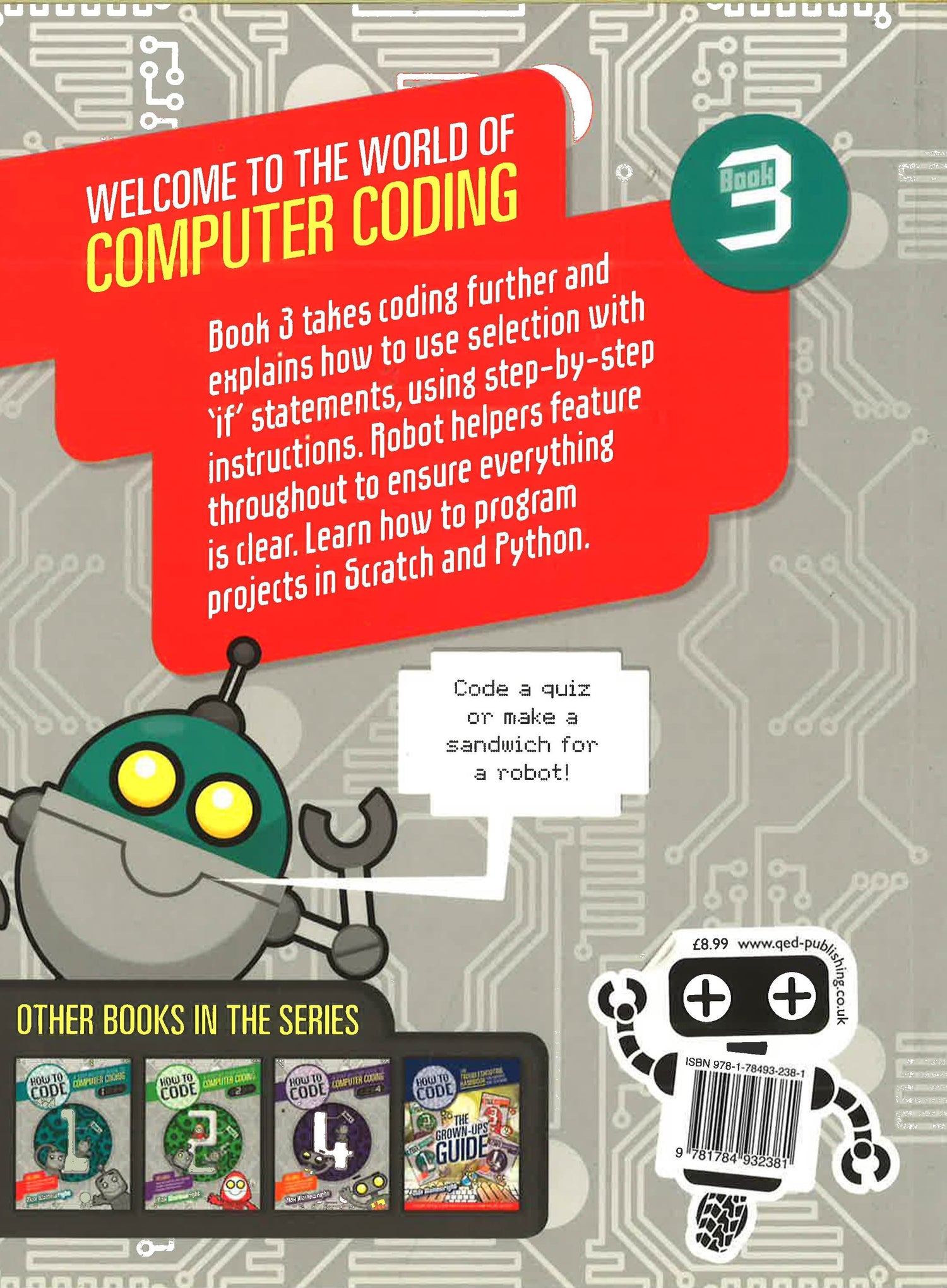 Welcome to the world of computer coding! Book 3 takes coding further and explains how to use selection with 'if' statements, using step-by-step instructions. Robot helpers feature throughout to ensure everything is clear. Learn how to program projects in Scratch and Python.