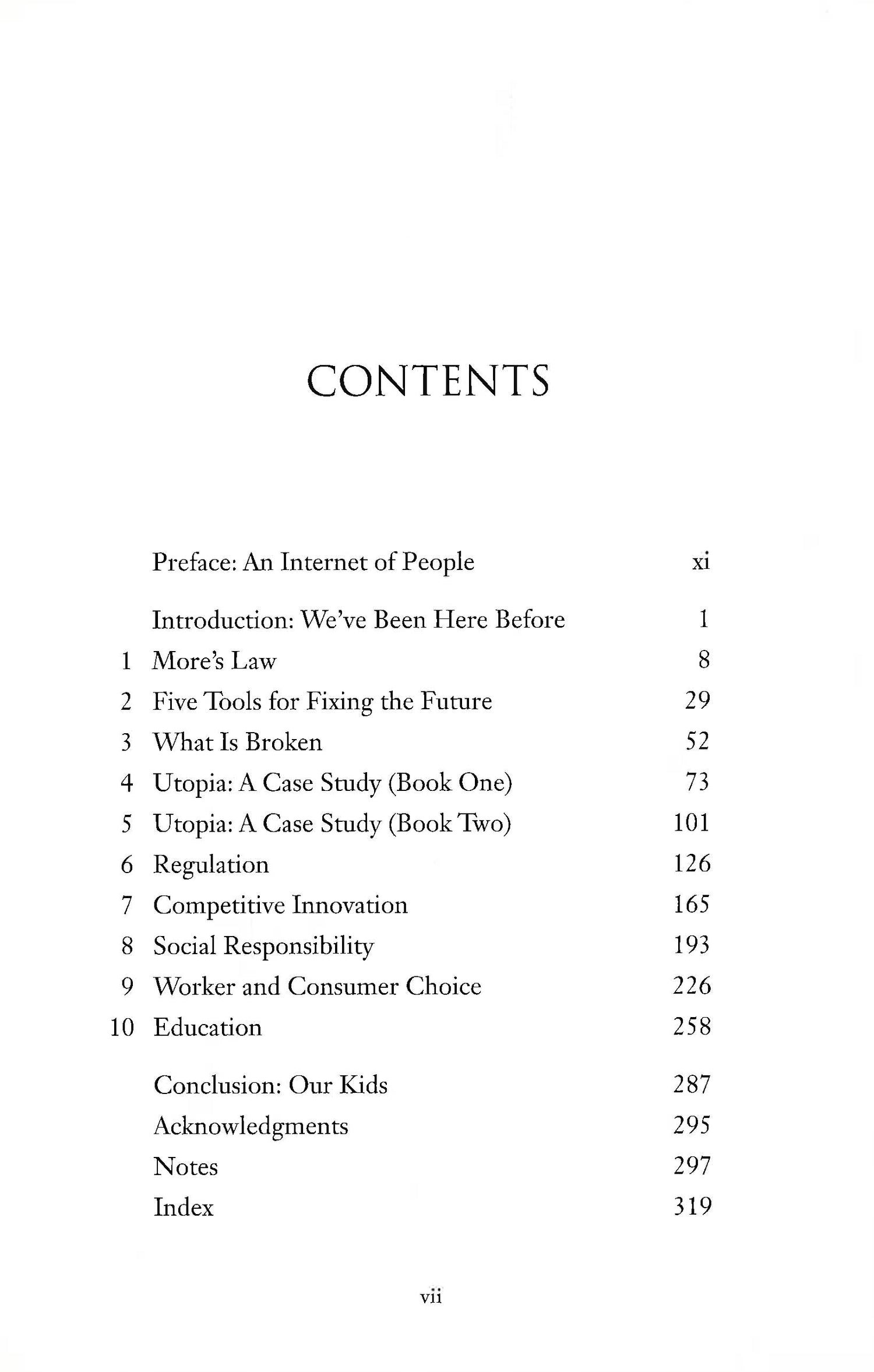 There are five key tools that Keen identifies: regulation, competitive innovation, social responsibility, worker and consumer choice, and education. His journey to discover how these tools are being put into practice around the globe takes him from digital-oriented Estonia, where Skype was founded and where every citizen can access whatever data the government holds on them by logging in to an online database, and where a "e-residency" program allows the country to expand beyond its narrow borders, to Singapore, where a large part of the higher education sector consists in professional courses in coding and website design, to India, Germany, China, Russia, and, of course, Silicon Valley.