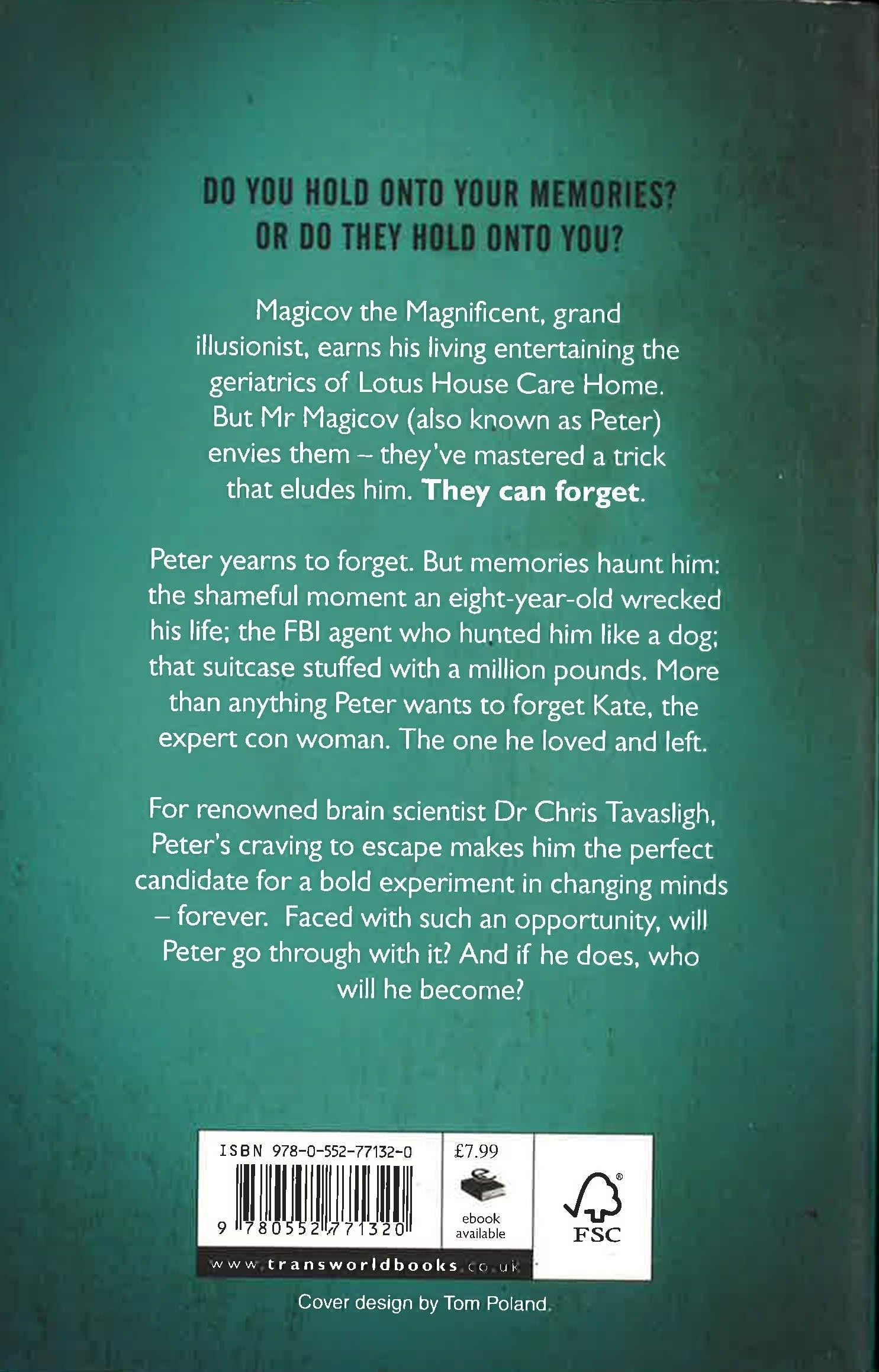 Do you hold on to your memories? Or do they hold on to you? Magicov the Magnificent, grand illusionist, earns his living entertaining the geriatrics of Lotus House Care Home. But Mr Magicov (also known as Peter) envies them - they've mastered a trick that eludes him. They can forget. Peter yearns to forget. But memories haunt him: the shameful moment an eight-year-old wrecked his life; the FBI agent who hunted him like a dog; that suitcase stuffed with a million pounds. More than anything Peter wants to forget Kate, the expert con woman. The one he loved and left. For renowned bain-scientist Dr Chris Tavasligh, Peter's craving to escape makes him the perfect candidate for a bold experiment in changing minds - forever. Faced with such an opportunity, will Peter go through with it? And if he does, who will he become?