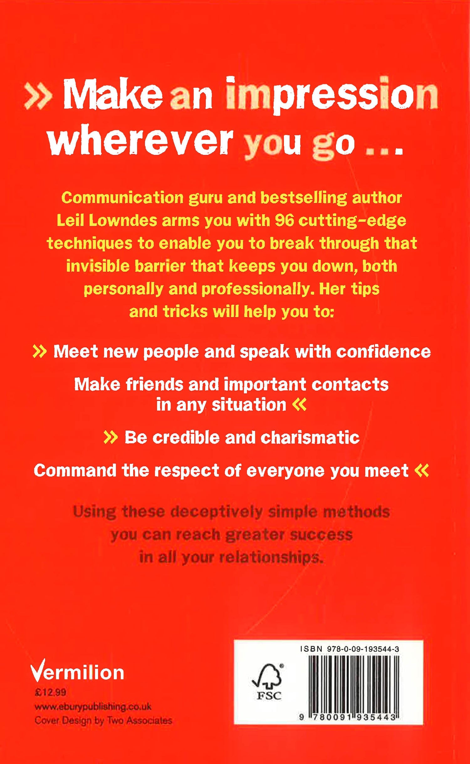 Communication guru and bestselling author Leil Lowndes arms you with 96 cutting-edge techniques to enable you to break through that invisible barrier that keeps you down, both personally and professionally. Her tips and tricks will help you to: Meet new people and speak with confidence. Make friends and important contacts in any situation. Be credible and charismatic. Command the respect of everyone you meet. Using these deceptively simple methods you can reach greater success in all your relationships.