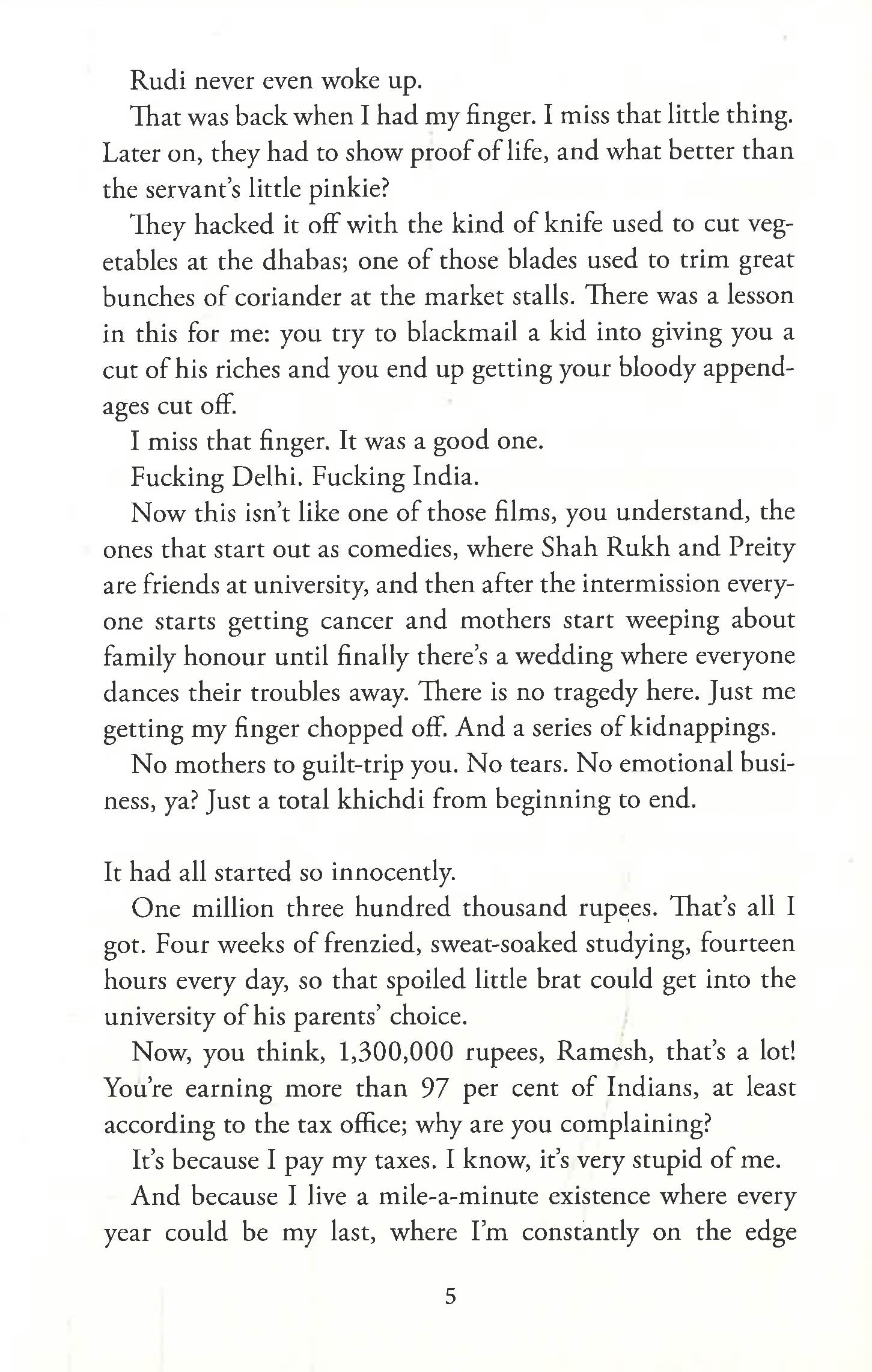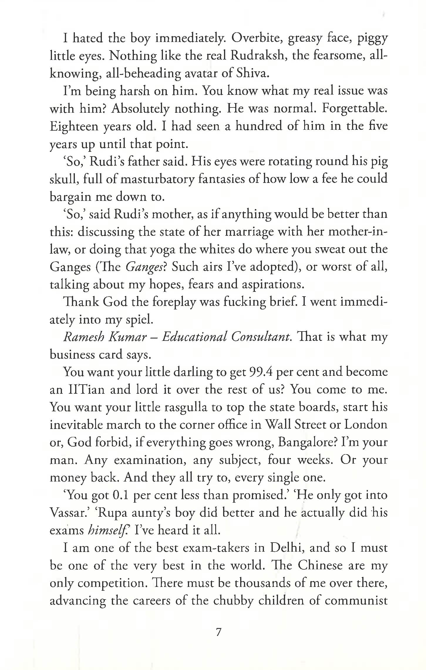 Ramesh Kumar grew up deprived and unloved, working on his father's tea stall in the Old City of Delhi. Now, brilliant but poor, he makes a lucrative living taking tests for the sons of India's elite. When one of his clients, the sweet but hapless eighteen-year-old Rudi Saxena, places first in the All Indias, the national university entrance exams, Ramesh sees an unmissable opportunity.