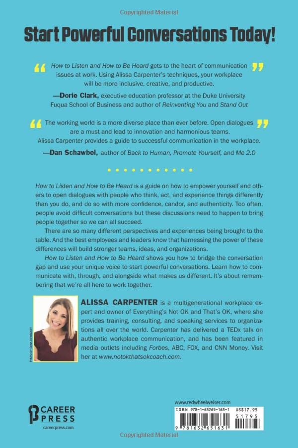 How to Listen and How to be Heard shows you how to bridge the conversation gap and use your unique voice to start powerful conversations. This book is about learning how to communicate with, through, and alongside what makes us different. It’s about open dialogue and practical tools that get everyone on the same page—or at least in the same room. It’s not about quick fixes or the absence of conflict; it’s about working toward authentic communication in the workplace—for managers, employees, and colleagues from all fields. It’s about remembering that we’re all here to work together.