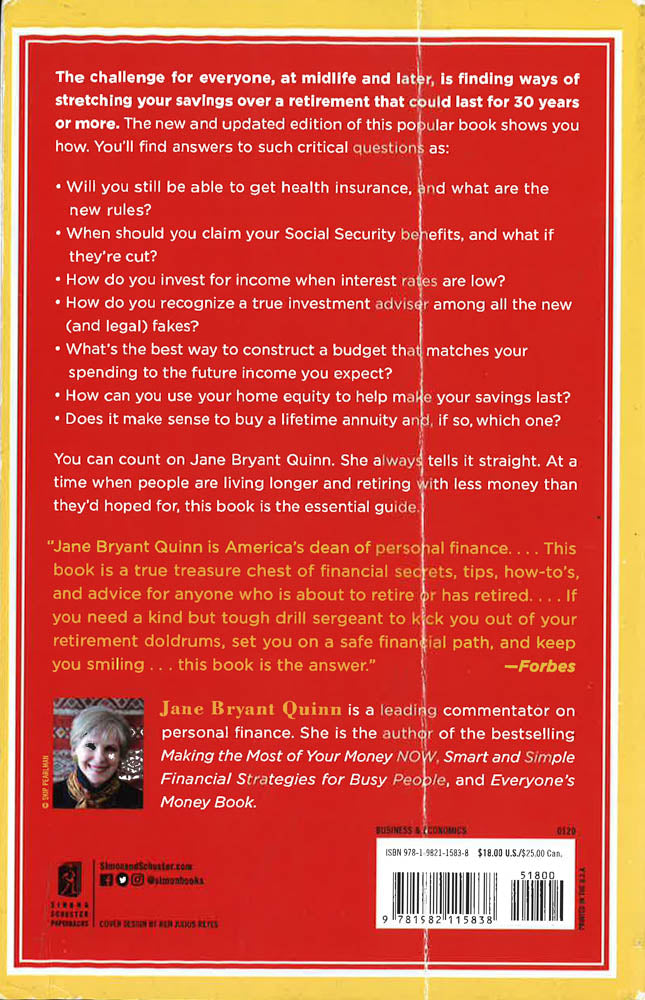 Will you run out of money in your older age? That&;s the biggest worry for people newly retired or planning to retire. Fortunately, you don&;t have to plan in the dark. Jane Bryant Quinn tells you how to squeeze a higher income from all your assets&;including your social security account (get every dollar you&;re entitled to), a pension (discover whether a lump sum or a lifetime monthly income will pay you more), your home equity (sell, rent, or take a reverse mortgage?), savings (how to use them safely to raise your monthly income), retirement accounts (invest the money for growth in ways that let you sleep at night), and&;critically&;how much of your savings you can afford to spend every year without running out. There are easy ways to figure all this out. Who knew?