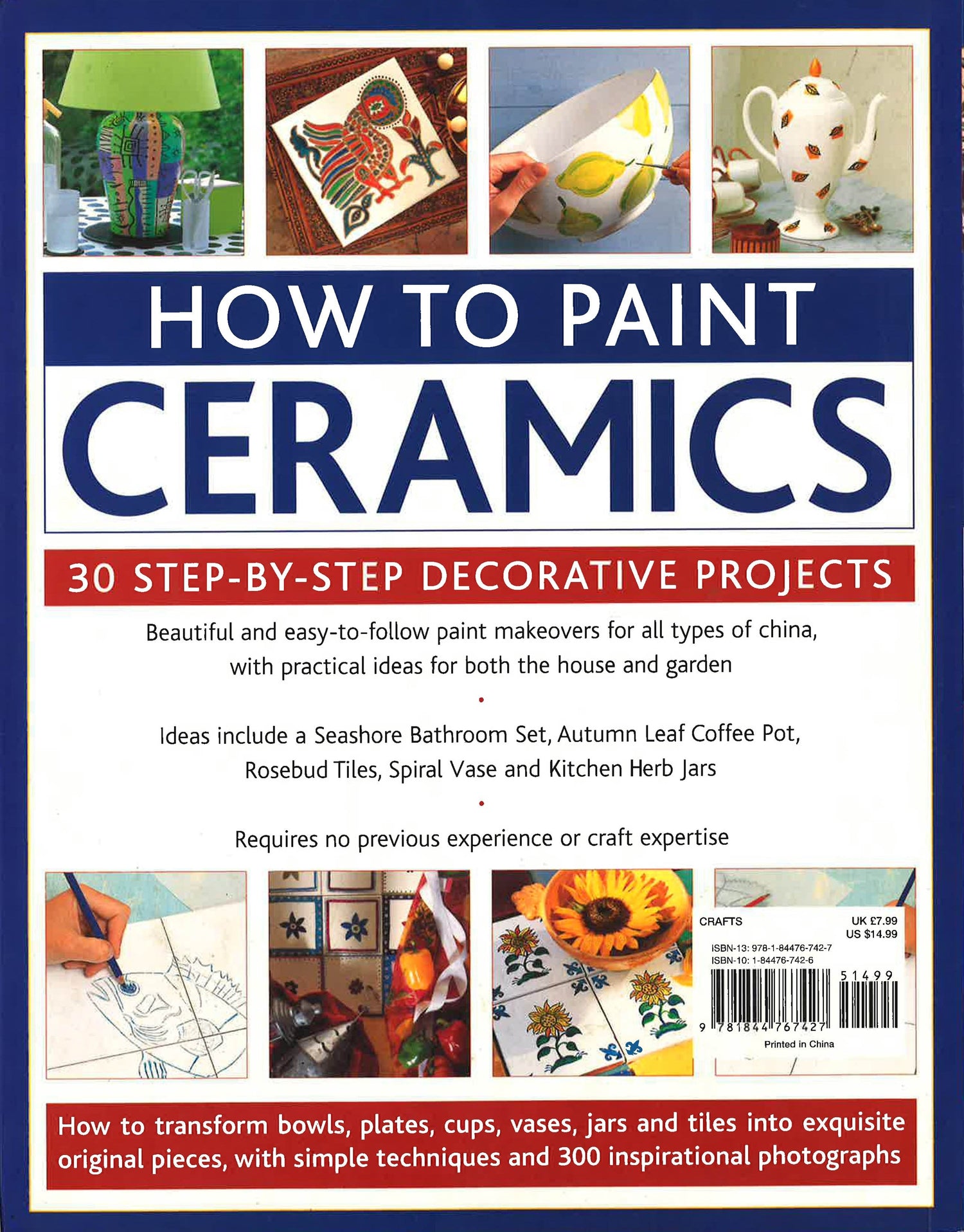 This title features over 30 beautiful and easy-to-follow decorative projects for all types of china, with practical ideas for both the house and garden. It is illustrated with over 300 pictures and detailed photographs of the finished results so that you can see exactly what you are aiming to achieve. You can learn how to transform plain fruit bowls, plates, jars, lamp bases, vases, pots, tiles and many other items with stunning and cheerful motifs. Projects include a Seashore Bathroom Set, Autumn Leaf Coffee Pot, Rosebud Tiles, Spiral Lamp Stand and a Mosaic Garden Table. It requires no previous experience or craft expertise. This delightful book shows how you can add vibrancy and interest to ceramics around the home, and transform them into beautiful objects that complement the rest of your decor. Painting ceramics is fun and easy to learn. The book is split into three main sections: Decorating Ceramics; Decorating Tiles; and Ceramic Mosaic. Each section begins by listing the materials and equipment needed, as well as step-by-step instructions to the basic techniques.Templates for all designs featured in this book are included at the back of the book, which can either be copied as they are, or used as a starting point for your own designs. There are more than 30 projects in total, from Sunflower Vase and Sponged Snowflake Plate through to Plant Pots and Arched Mirror. With step-by-step instructions throughout and 300 inspirational photographs, this creative sourcebook will provide a wealth of ideas for craft enthusiasts of all abilities.