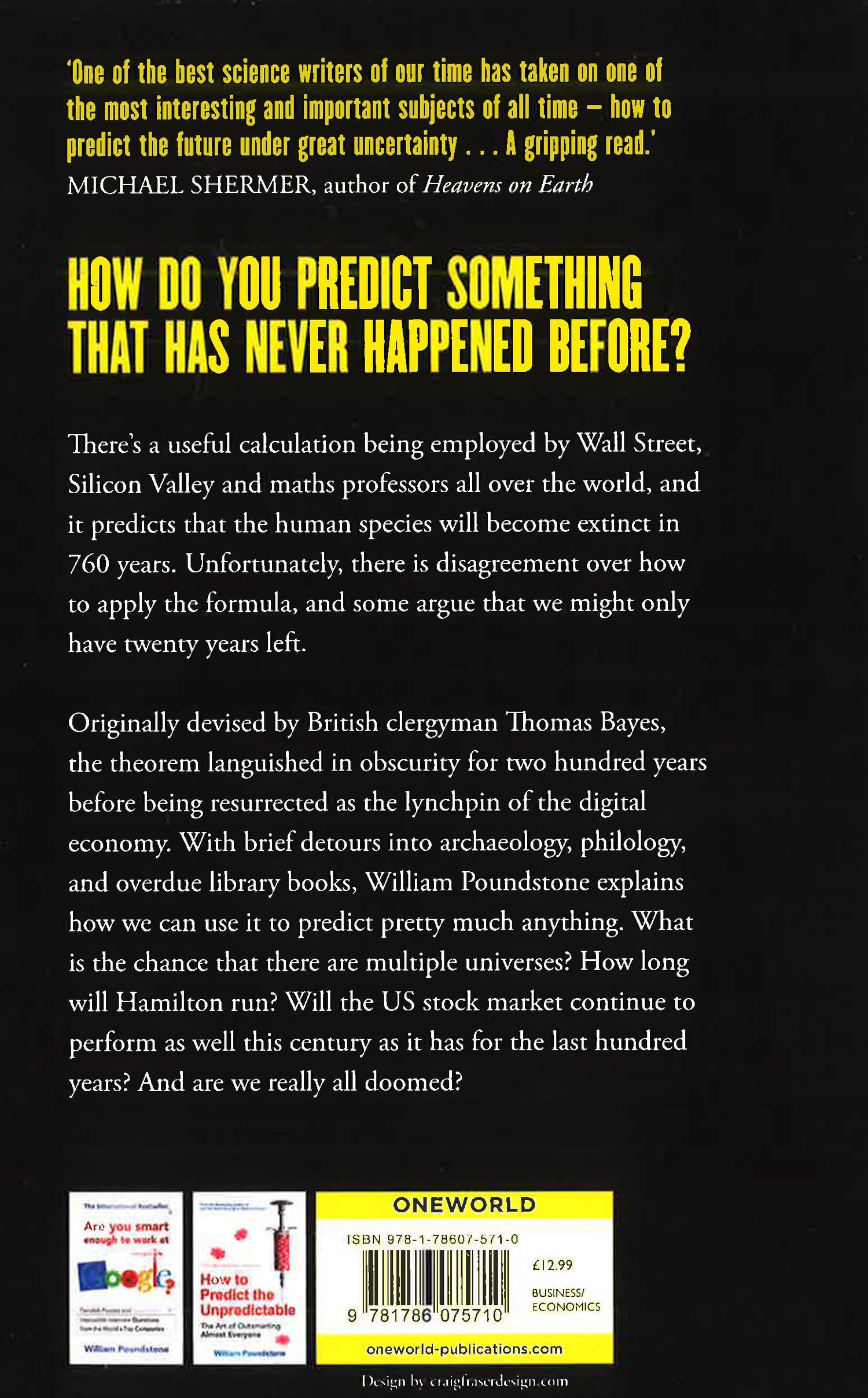 Originally devised by British clergyman Thomas Bayes, the theorem languished in obscurity for two hundred years before being resurrected as the lynchpin of the digital economy. With brief detours into archaeology, philology, and overdue library books, William Poundstone explains how we can use it to predict pretty much anything. What is the chance that there are multiple universes? How long will Hamilton run? Will the US stock market continue to perform as well this century as it has for the last hundred years? And are we really all doomed?