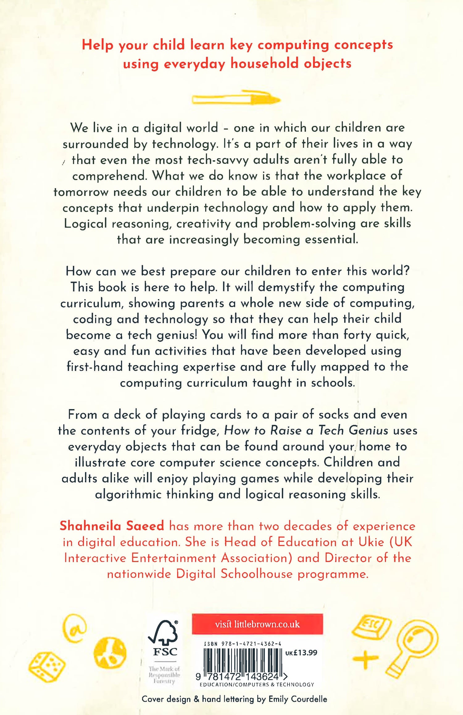 Teach computing concepts without computers! How to Raise a Tech Genius makes the computing curriculum accessible for parents and families.We live in a digital world - one in which our children are surrounded by technology. It's a part of their lives in a way that even the most tech-savvy adults aren't fully able to comprehend. What we do know is that the workplace of tomorrow will require our children to harness the power behind the technology, to be able to understand key concepts and apply them. Logical reasoning, creativity and problem solving are skills that are becoming increasingly essential in the world of work. How can we best prepare our children to enter this world? How to Raise a Tech Genius is a practical book that assumes no prior knowledge or understanding of computing and enables parents to learn skills and concepts alongside their children. The quick, easy and fun fifteen-minute activities within the book have been developed using first-hand teaching expertise and are fully mapped to the computing curriculum taught in schools. From a deck of playing cards to the story books on your bookshelf or even the contents of your fridge, How to Raise a Tech Genius uses everyday objects that can be found around your home to illustrate core computer science concepts. Children and adults alike will enjoying playing games while developing their algorithmic thinking and logical reasoning skills. This book demystifies the computing curriculum for adults, showing parents a whole new side of computing, coding and technology so that they can help their child become a computing genius!