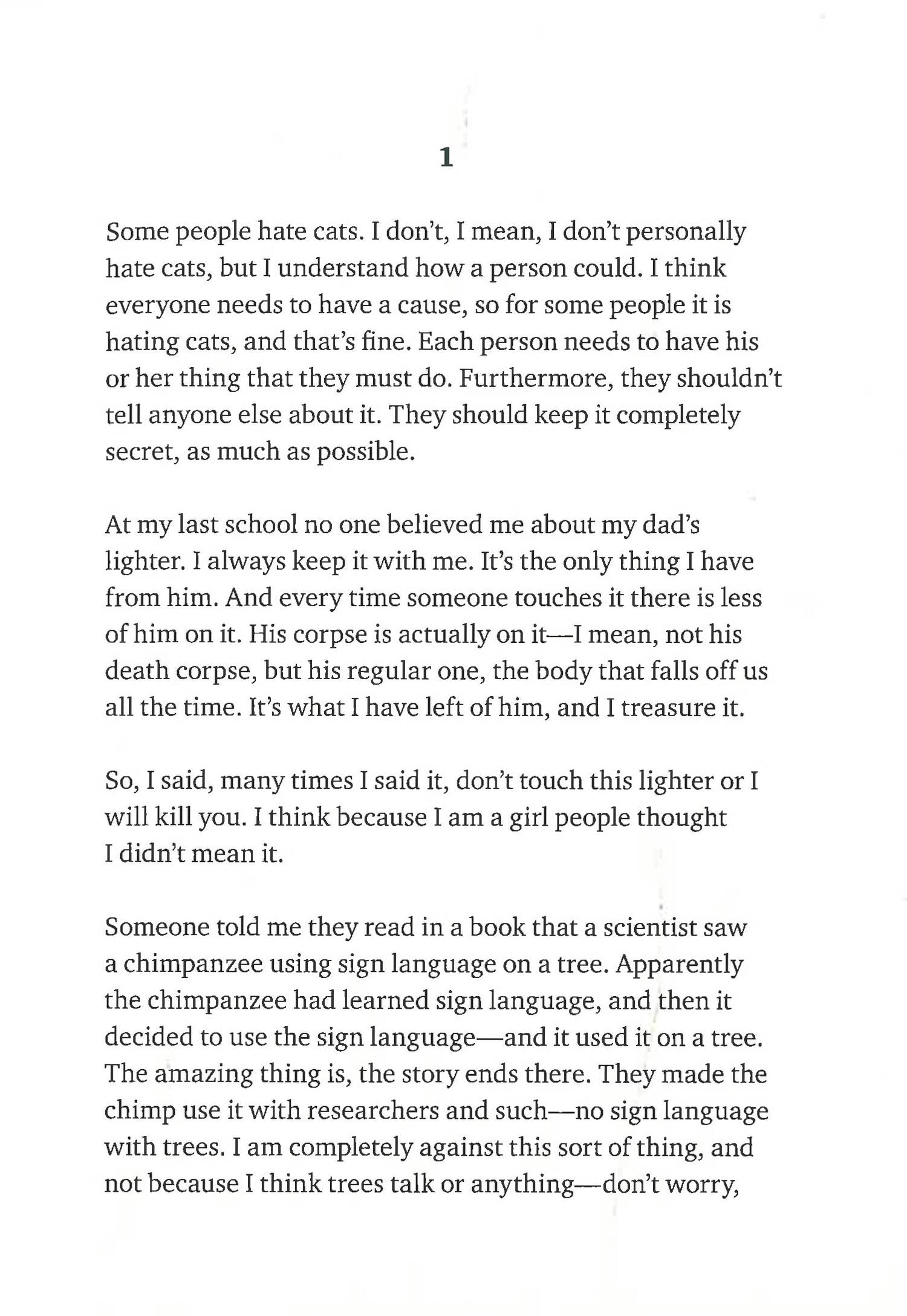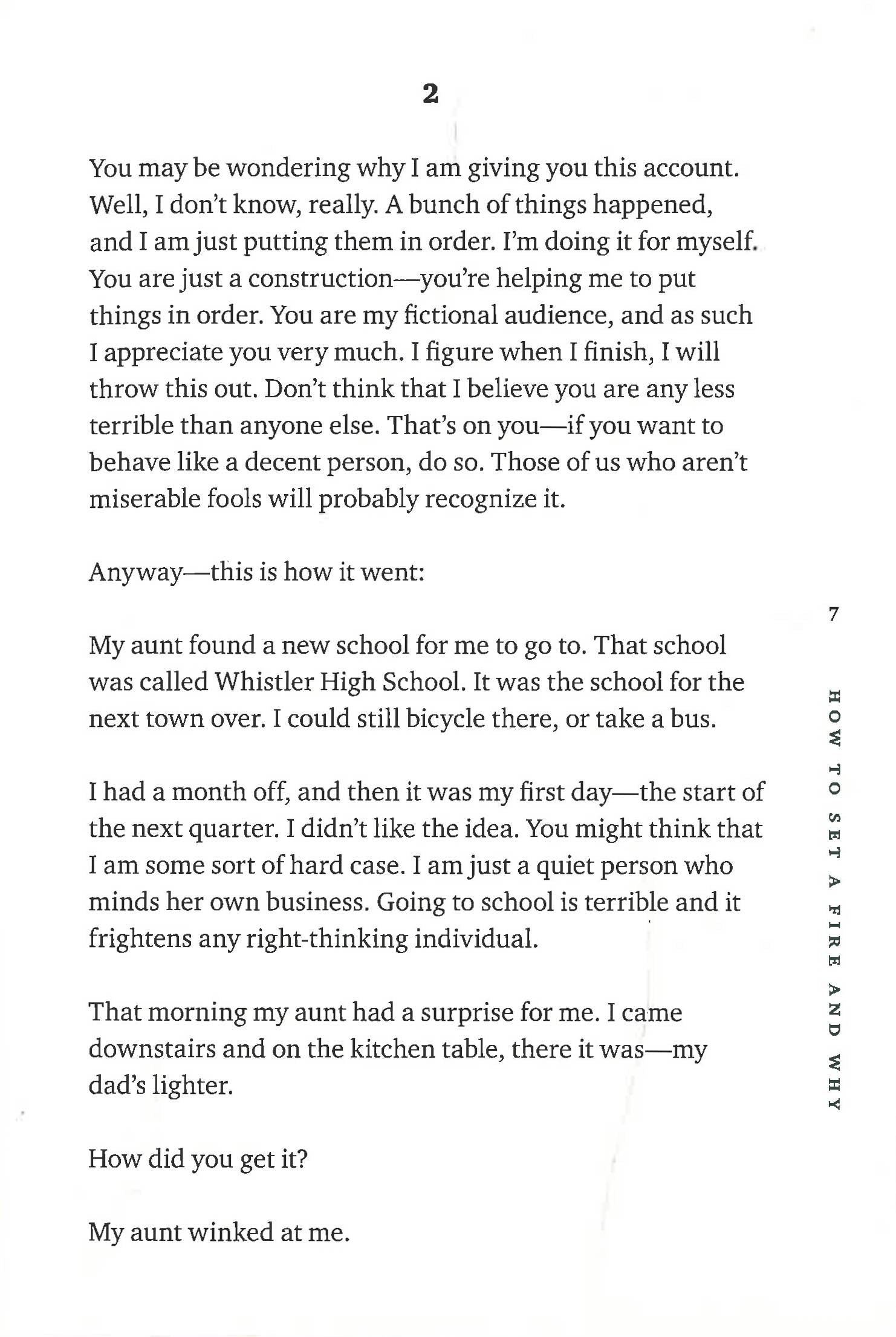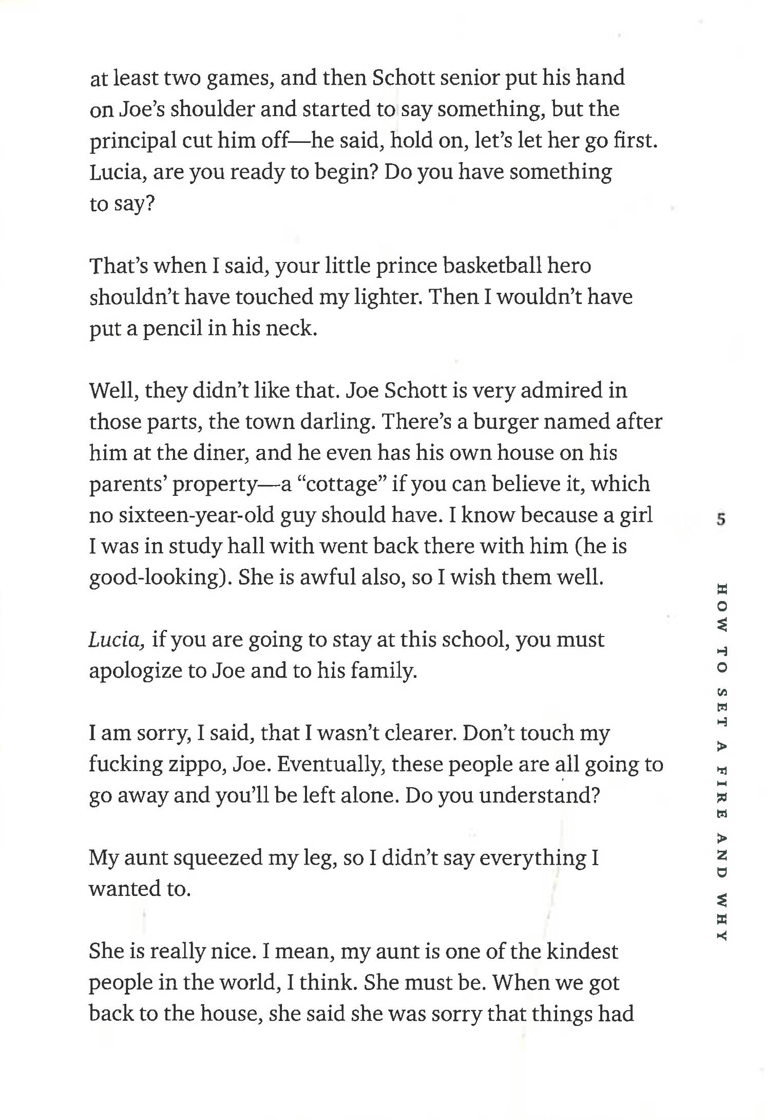 A teenage girl. A shattering loss. An obsession with a secret arson club. This is the story of a girl who has nothing and will burn anything. Lucia s father is dead, her mother is in a mental hospital, and she s living in a garage-turned-bedroom with her aunt. And now she s been kicked out of school again. Making her way through the world with only a book, a zippo lighter, a pocketful of stolen licorice, a biting wit, and the striking intelligence that she tries to hide, Lucia spends her days riding the bus to visit her mother and following the only rule that makes any sense to her: "Don t do things you aren t proud of. "But when she discovers that her new school has a secret Arson Club, she s willing to do anything to be a part of it, and her life is suddenly lit up. As Lucia s fascination with the Arson Club grows, her story becomes one of misguided friendship and, ultimately, destruction."