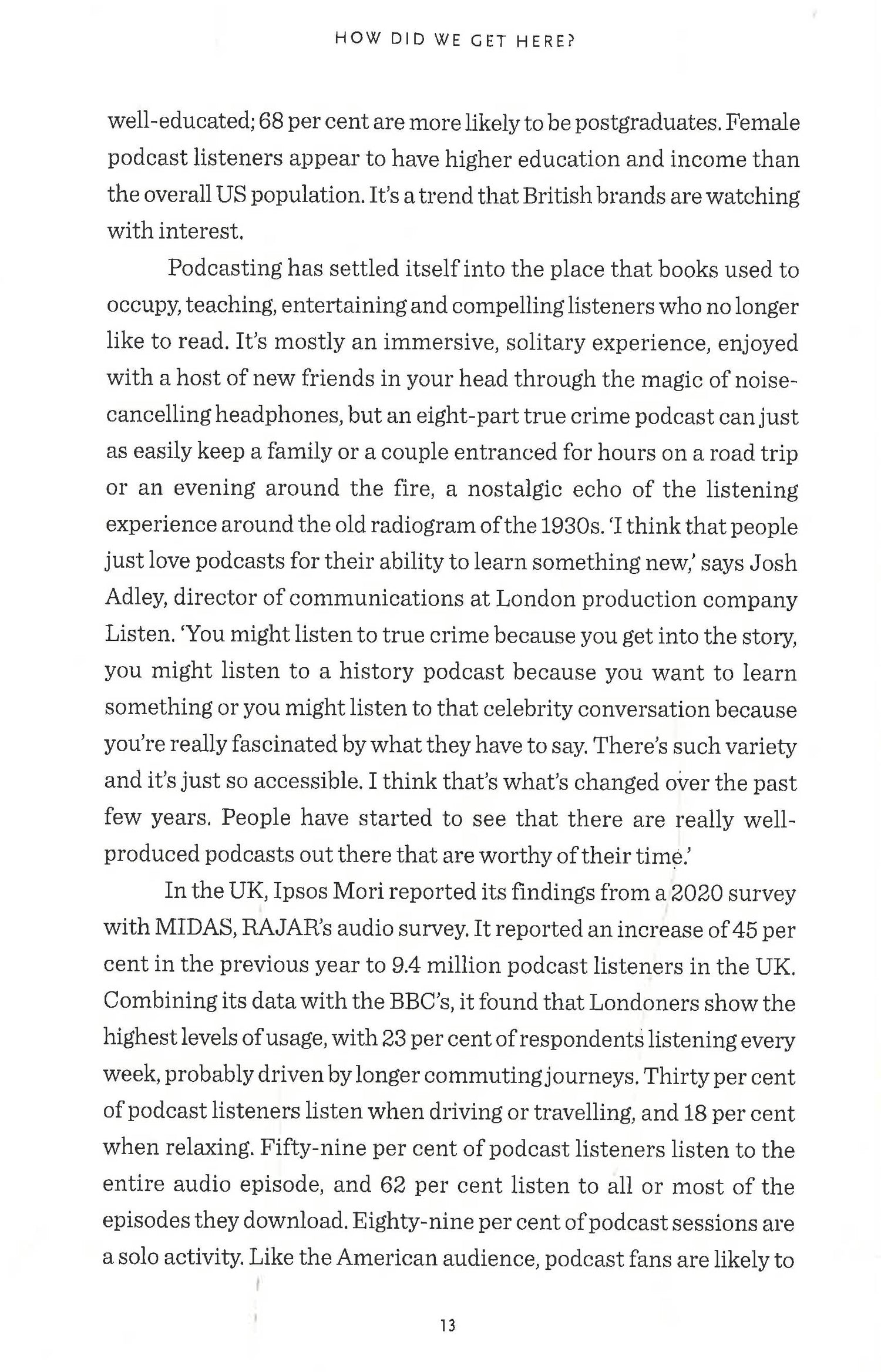 The only guide you need to build a podcast from scratch with tips, techniques and stories from the pioneers of podcasting, by expert and early adopter Gilly Smith. From This American Life's Ira Glass and George the Poet to the teams behind My Dad Wrote a Porno and Table Manners with Jessie Ware, this practical book is packed full of exclusive, behind-the-scenes advice and informative, inspiring stories that will teach you how to tell the greatest stories in the world.This is a comprehensive yet accessible and warmly written book for creatives who are striving to understand how their content could be successfully turned into a podcast, from conception through to execution, distribution, marketing and monetising. It covers:- Recognising who your show is for, deciding what it is about and where to find inspiration.- Deciding on the format and working on structure and script.- Hosting, casting and interview techniques.- Production expertise - from equipment you'll need to editorial tips and determining the ideal length of your show.- Distribution - deciding on a release schedule, show art, metadata and how to distribute. - Growing your podcast - promotion and building community among fans. With original material throughout, case studies from podcasters across genres and a companion podcast featuring interviews with the pioneers, this is a first in guides to podcasting.