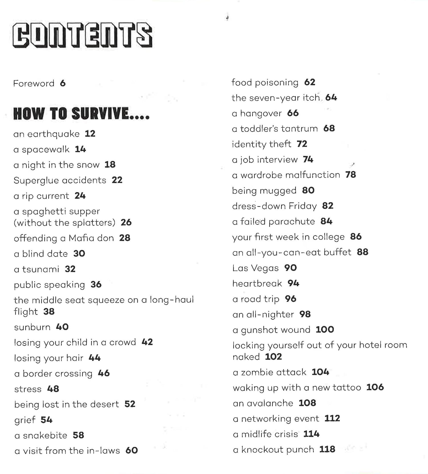How to Survive Anything. A visual guide to laughing in the face of adversity. Earthquake imminent? Stuck in the middle seat on a long-haul flight? Here is a book that will teach you How To Survive Anything. Using the witty, graphic format it will help you withstand any challenge, from the extreme to the ordinary, that life might throw your way.