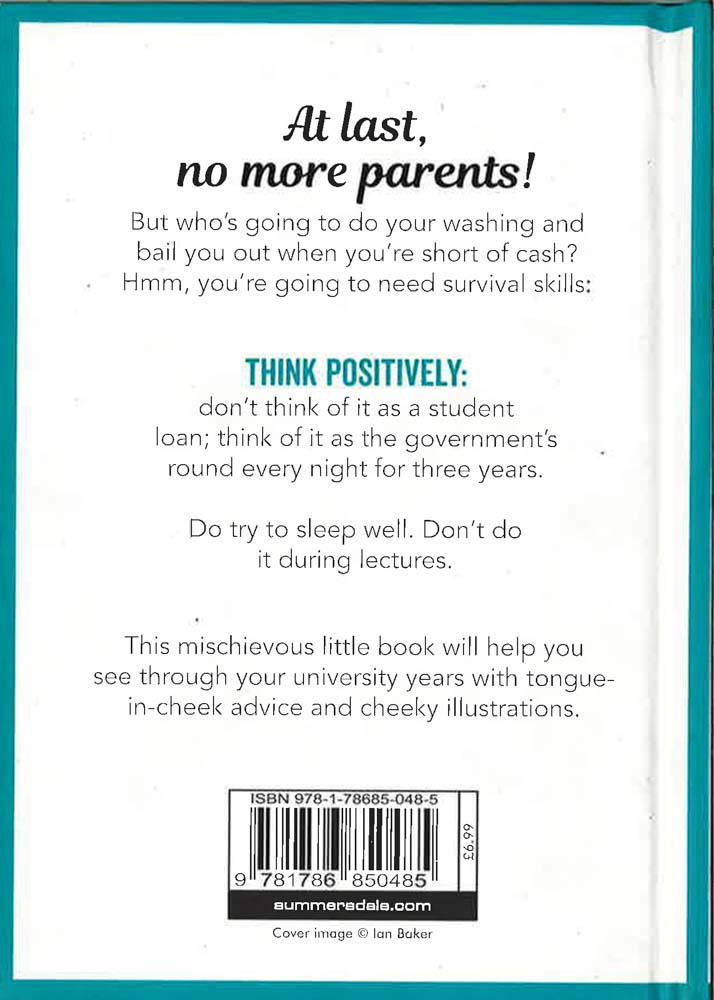 At last, no more parents! But who's going to do your washing, and bail you out when you're short of cash? Hmm, you're going to need survival skills: Think positively: don't think of it as a student loan, think of it as the government's round (every night for three years). Do try to sleep well. Don't do it during lectures.