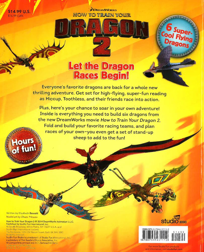 Based on the sequel to the 2010 How to Train Your Dragon, this action-packed storybook adventure comes with dragons to build and fly. In this storybook, based on the sequel to the Dreamworks 3D computer-animated fantasy action film, How to Train Your Dragon 2, Hiccup and his friends are ready to race as they meet new dragons and discover new lands. After reading the action-filled pages, kids can build six cardstock dragons that really fly! Choose to fly Toothless, BarfBelch, Hookfang, or a dragon from the new movie!