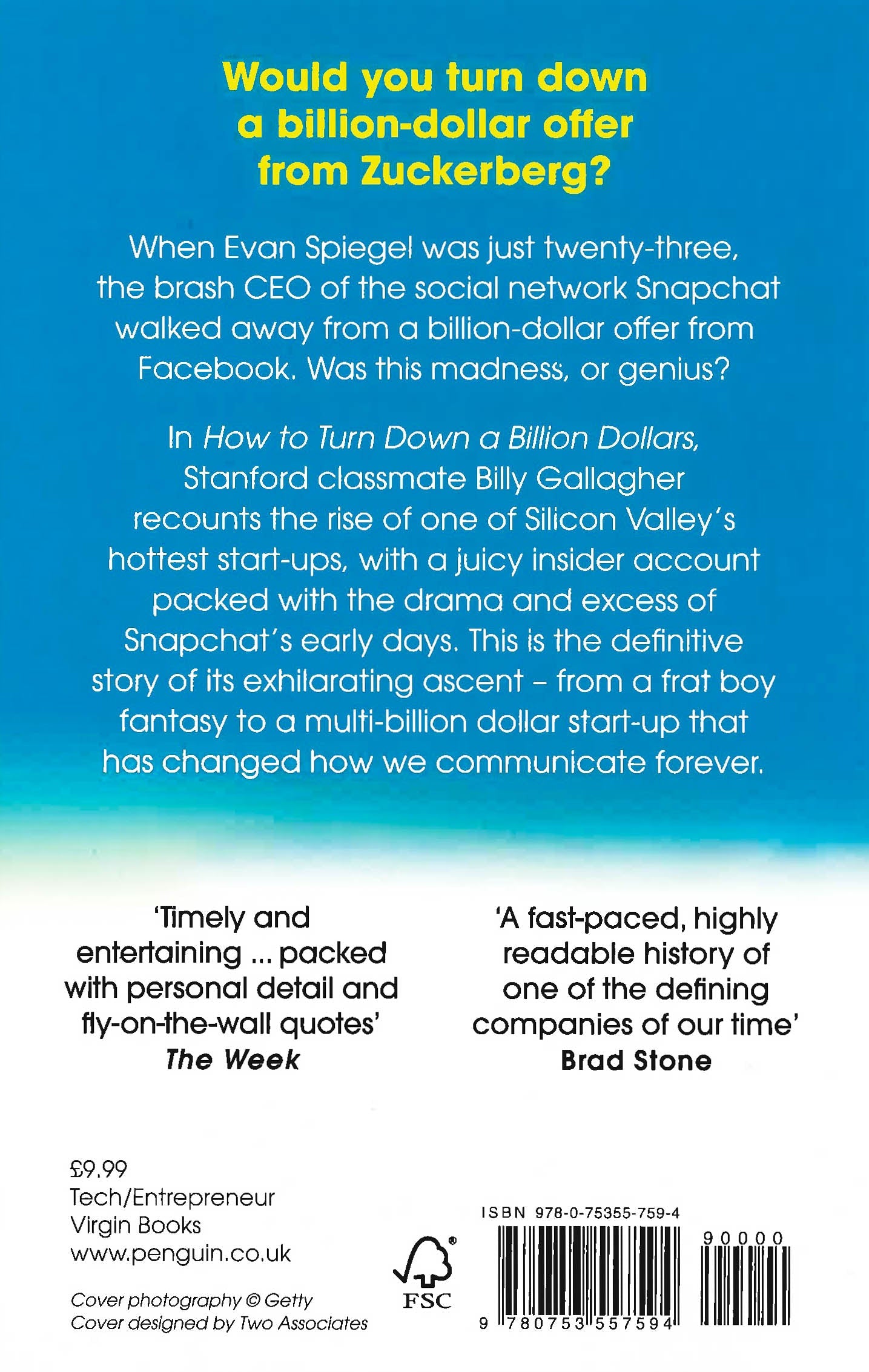 In How to Turn Down a Billion Dollars, Billy Gallagher takes us inside the rise of one of Silicon Valley's hottest start-ups. Snapchat began as a late-night dorm room revelation before Spiegel went on to make a name for himself as a visionary CEO worth billions, linked to celebrities like Taylor Swift and his fiancee, Miranda Kerr.