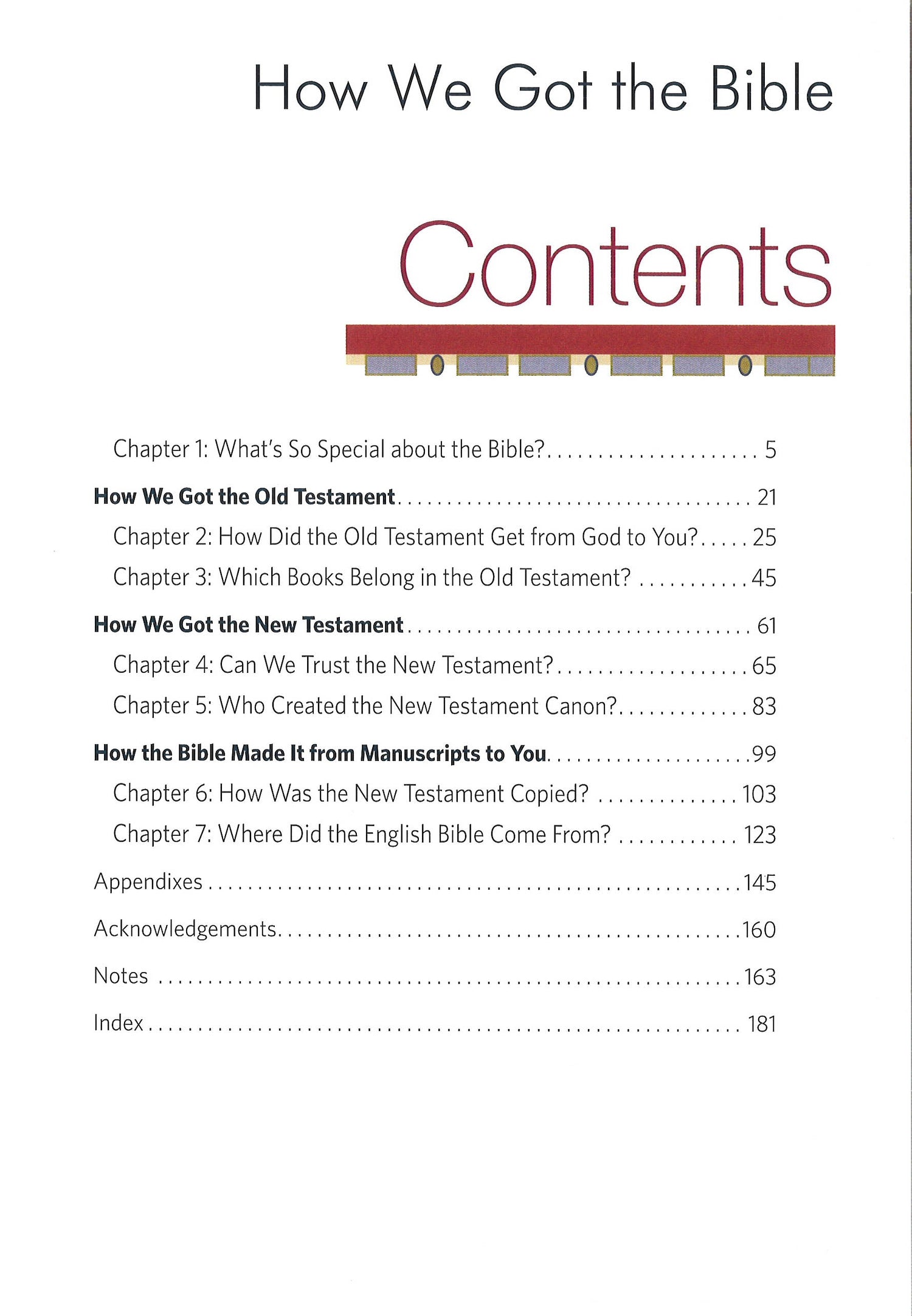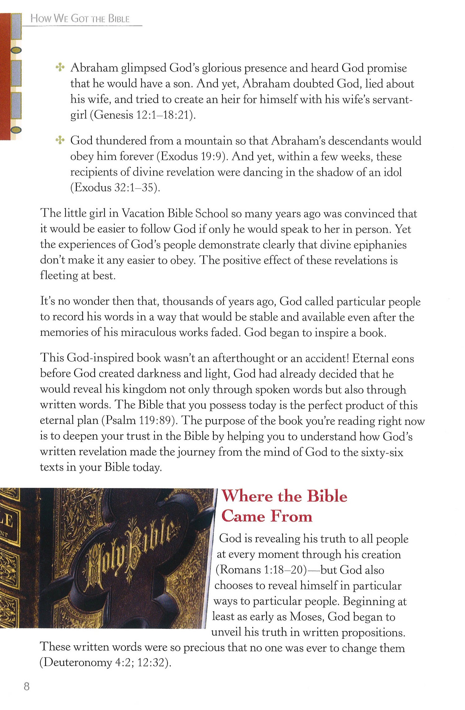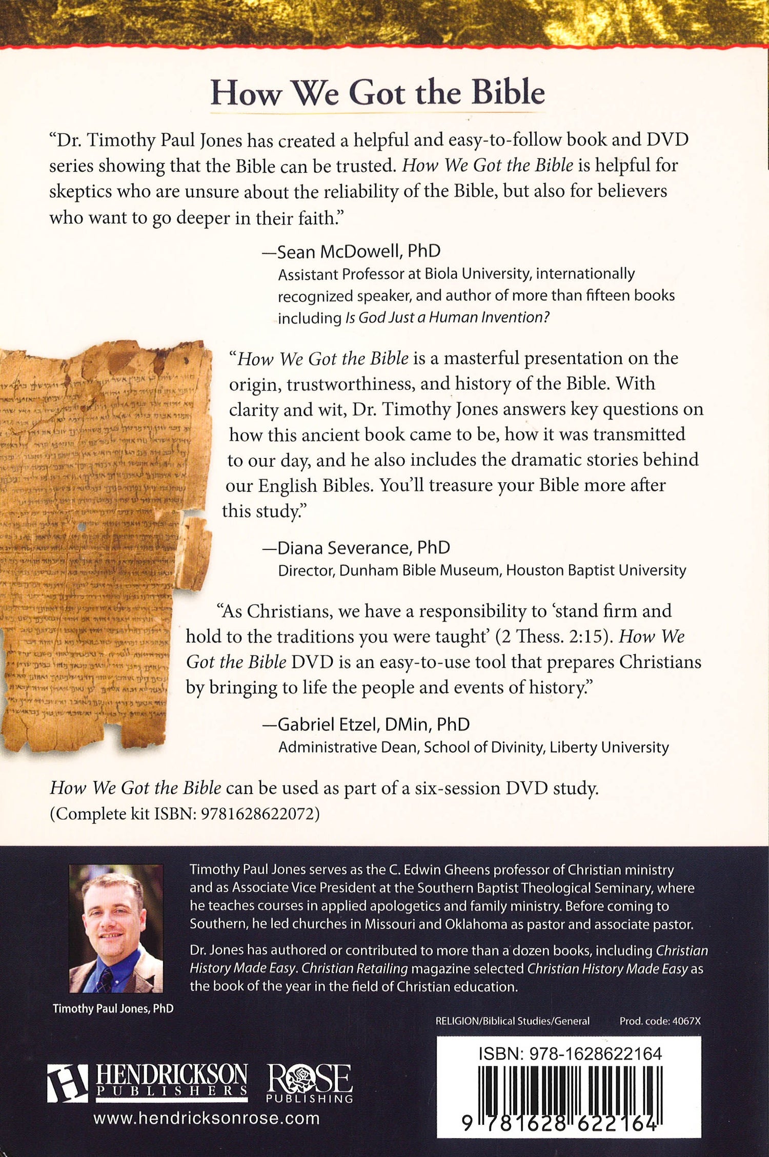 Have you ever wondered where the Bible came from? Who wrote the books of the Bible and how did they end up together? Perhaps you have been asked by a friend or coworker about books that were cut out of the Bible. Through seven dynamic chapters in How We Got the Bible, expert Dr. Timothy Paul Jones will guide you through all the important questions about the Holy Bible to show you why it can be trusted. Filled with dramatic stories and highly-visual charts and illustrations, this exciting Bible History handbook will take you from the earliest clay tablets and papyrus copies to the first bound Bible and the various Bible translations that we use today! Discover--