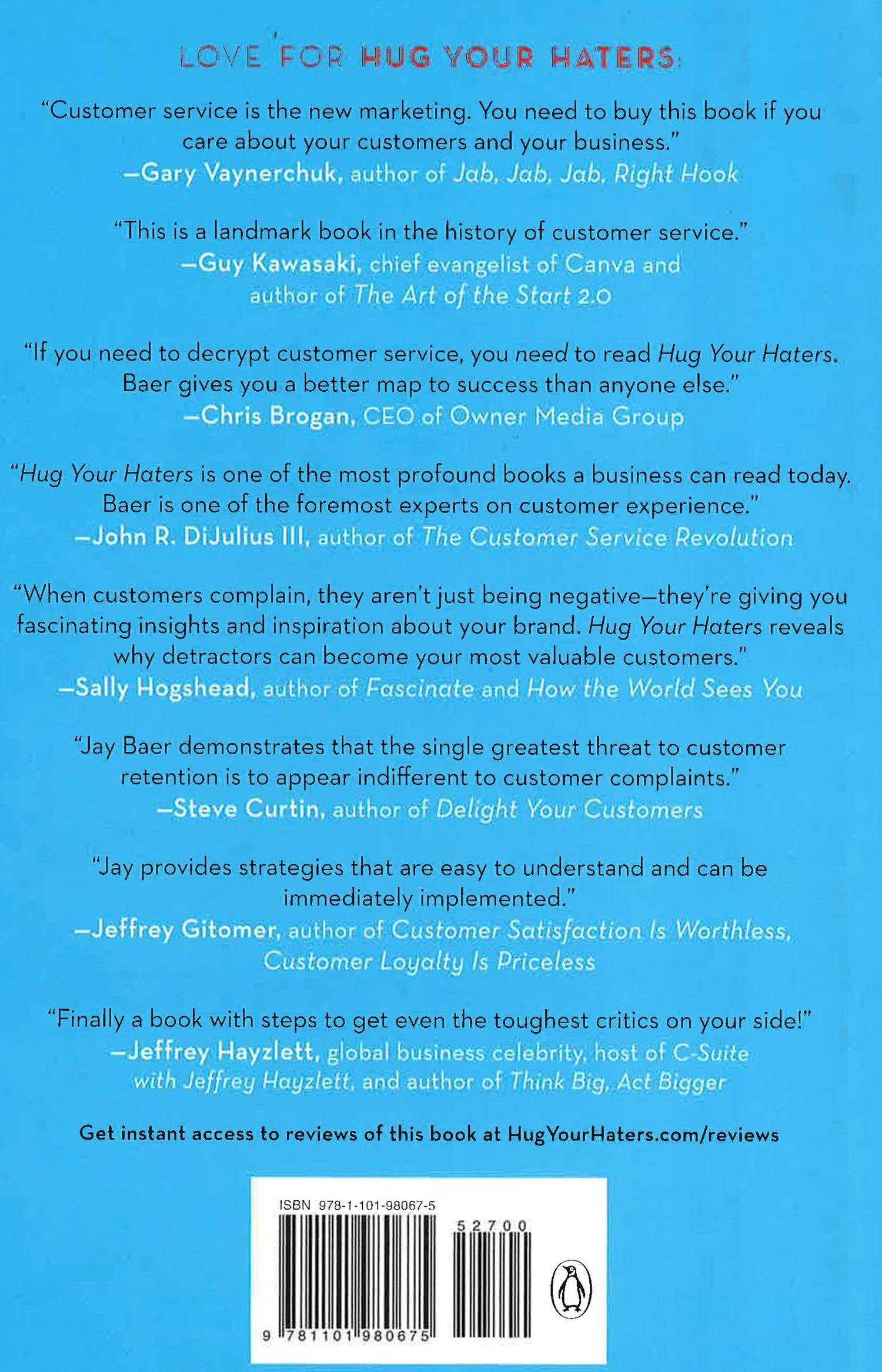 Haters are not your problem. . . . Ignoring them is. Eighty percent of companies say they deliver out-standing customer service, but only 8 percent of their customers agree. This book will help you close that gap by reconfiguring your customer service to deliver knockout experiences. The near-universal adoption of smartphones and social media has fundamentally altered the science of complaints. Critics ("haters") can now express their displeasure faster and more pub-licly than ever. These trends have resulted in an overall increase in complaints and a belief by many businesses that they have to "pick their spots" when choosing to answer criticisms. Bestselling author Jay Baer shows why that approach is a major mistake. Based on an exten-sive proprietary study of how, where, and why we complain, Hug Your Haters proves that there are two types of complainers, each with very differ-ent motivations: -Offstage haters. These people simply want solutions to their problems. They complain via legacy channels where the likelihood of a response is highest--phone, e-mail, and com-pany websites. Offstage haters don't care if any-one else finds out, as long as they get answers. -Onstage haters. These people are often disap-pointed by a substandard interaction via tradi-tional channels, so they turn to indirect venues, such as social media, online review sites, and discussion boards. Onstage haters want more than solutions--they want an audience to share their righteous indignation. Hug Your Haters shows exactly how to deal with both groups, drawing on meticulously researched case studies from businesses of all types and sizes from around the world. It includes specific play-books and formulas as well as a fold-out poster of "the Hatrix," which summarizes the best strate-gies for different situations. The book is also filled with poignant and hilarious examples of haters gone wild, and companies gone crazy, as well as inspirational stories of companies responding with speed, compassion, and humanity. Whether you work for a mom-and-pop store or a global brand, you will have haters--and you can't afford to ignore them. Baer's insights and tactics will teach you how to embrace complaints, put haters to work for you, and turn bad news into good outcomes.