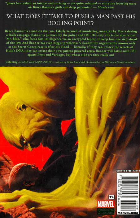 What does it take to push a man past his boiling point? Bruce Banner is a man on the run. Falsely accused of murdering young Ricky Myers during a Hulk rampage, Banner is pursued by the police and FBI. His only ally is the mysterious "Mr. Blue," who feeds him intelligence via an encrypted laptop to keep him one step ahead of the law. And Banner has even bigger problems: A clandestine organization known only as the Secret Conspiracy is after his blood - literally. Banner will battle with FBI agents Pratt and Verdugo, but whose side are they really on? COLLECTING: INCREDIBLE HULK (2000) 40-49