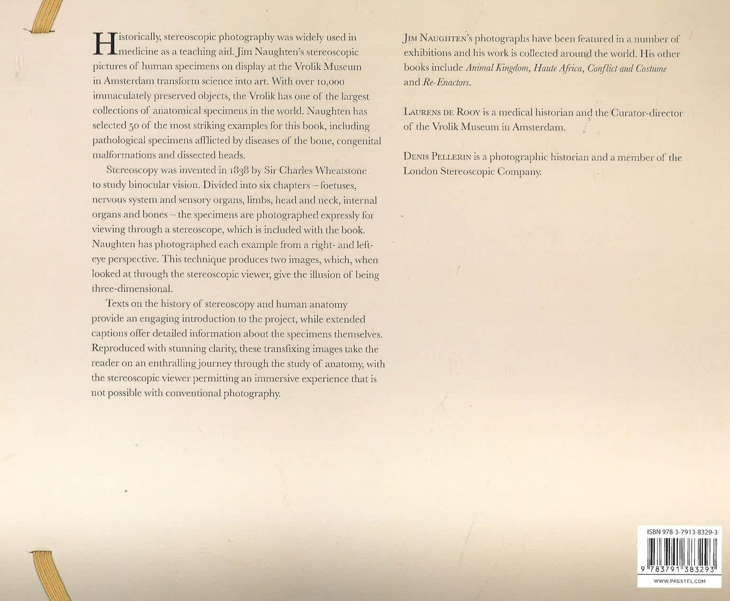 Historically, stereoscopic photography was widely used in medicine as a teaching aid, so it seems fitting that Jim Naughten's stereoscopic pictures of human specimens on display at the Vrolik Museum in Amsterdam transform science into art. With over 5,000 immaculately preserved objects, the Vrolik has one of the largest collections of anatomical specimens in the world. Naughten has selected 50 of the most striking examples for this book, including pathological specimens such as skeletons afflicted by rickets and other diseases of the bone; congenital malformations; and dissected heads. Many are photographed in their original wood and glass specimen cases, which lends them a haunting tone. Reproduced with stunning clarity, these transfixing images take the reader on a fascinating journey through the history of the study of anatomy, with the stereoscopic viewer permitting an immersive experience that is not possible with conventional photography