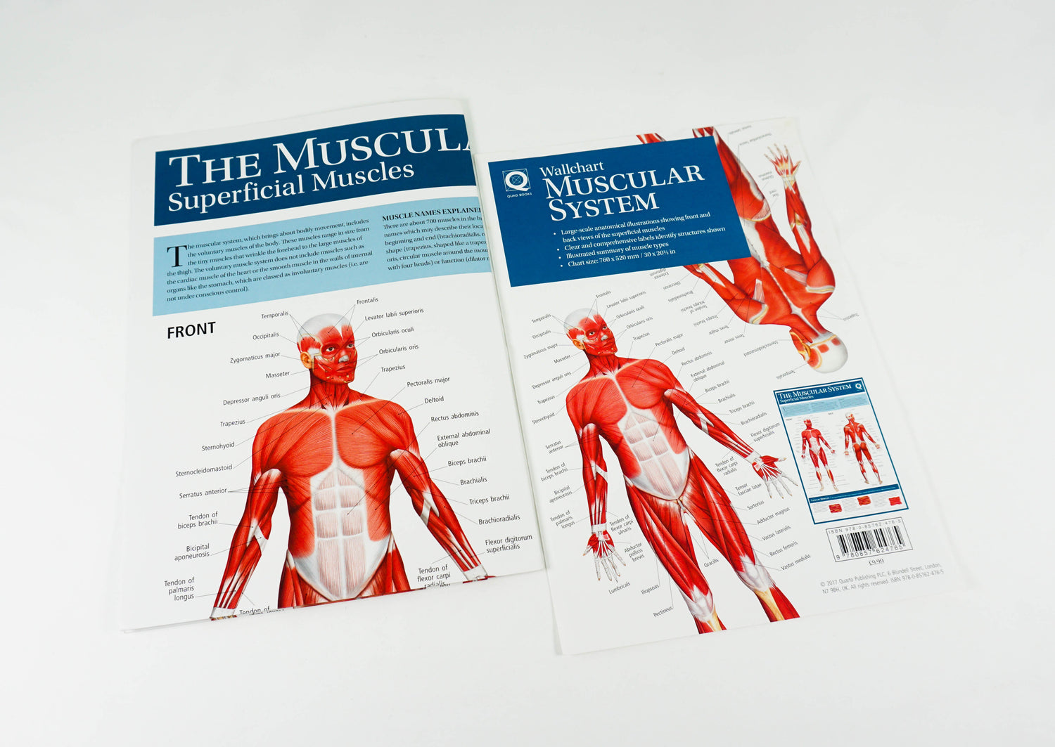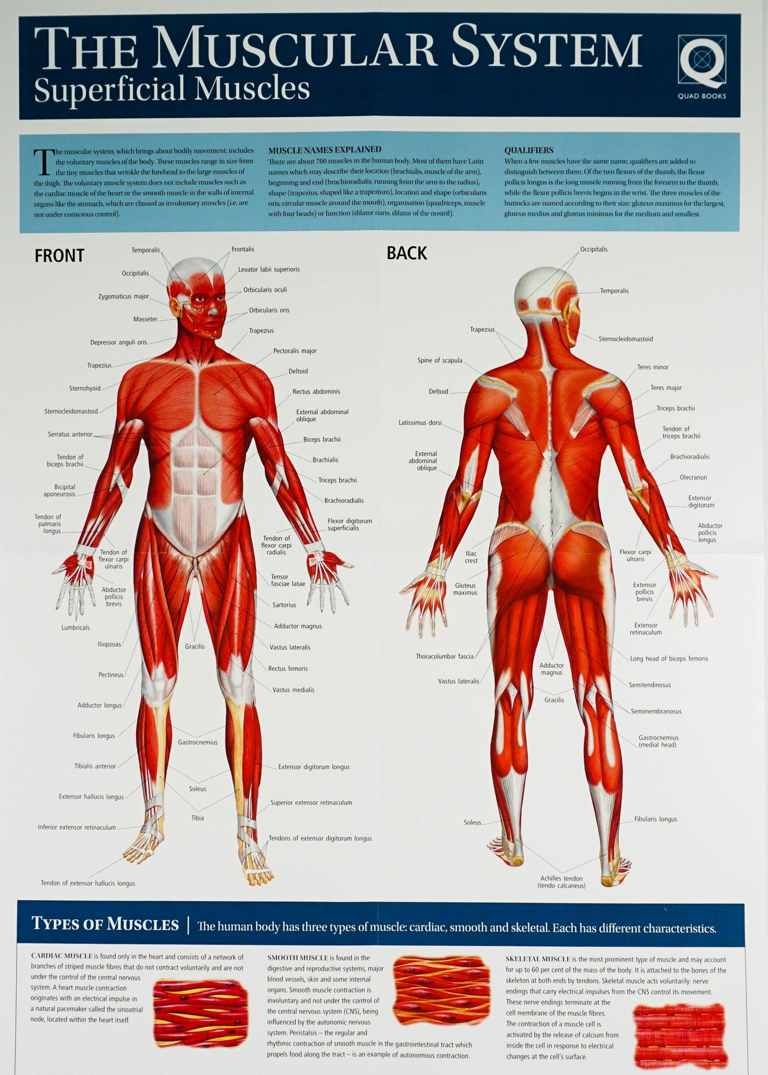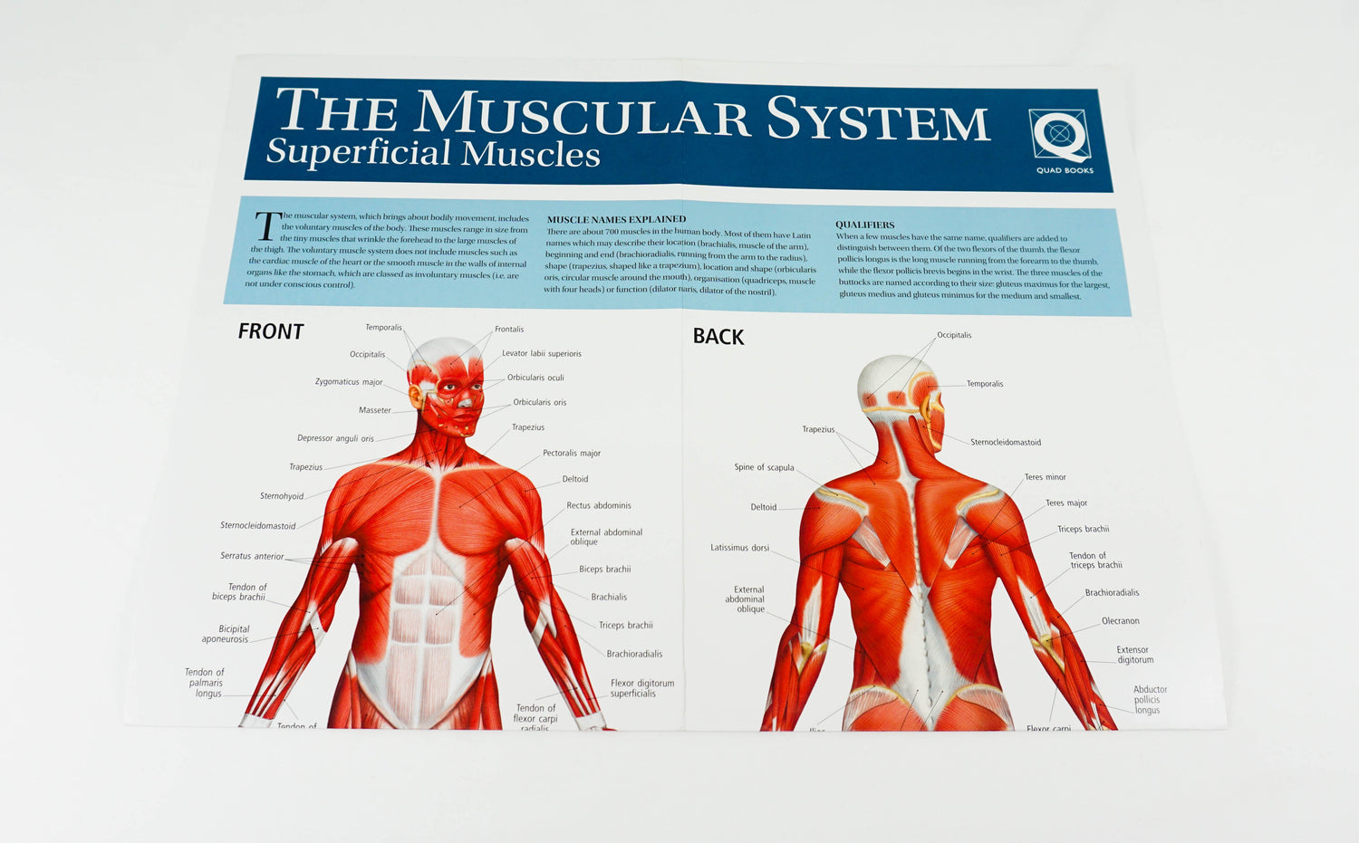 Showing the front and back views this chart illustrates and labels individual muscles, alongside introductory text and detailed illustrations.