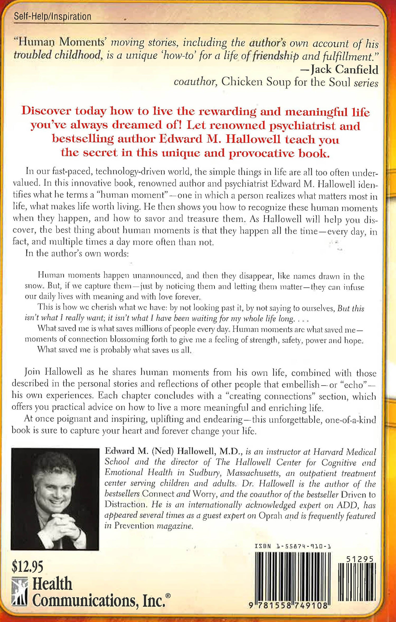 Human Moments is unlike any book available today. Renowned author Edward Hallowell proposes a simple, effective way to find happiness and love in this totally unique guide to living a fulfilling life. Dr. Hallowell teaches us how to recognize and appreciate a "human moment," an instance when we recognize and connect to things that really matter most in life and make it worth living. An engaging storyteller, Hallowell uses his own personal experiences from a traumatic childhood to a prosperous adulthood to illustrate concepts and connect with readers. Skillfully he teaches us how to recognize human moments when they happen, how to savor them, treasure them, and turn them into an enriching experience. Best of all, he reveals how human moments are happening to us all the time-in fact, every day. Hallowell forms each chapter around narratives of intensely moving stories from his own life and embellishes them with personal accounts and reflections from others. He concludes each one with suggestions on "creating connections" in our own lives through which we find true meaning and love. For all those engaged in the ongoing work of personal growth and life enrichment, Human Moments is at once poignant and inspiring, uplifting and endearing-an unforgettable book that will awaken hearts and change lives.