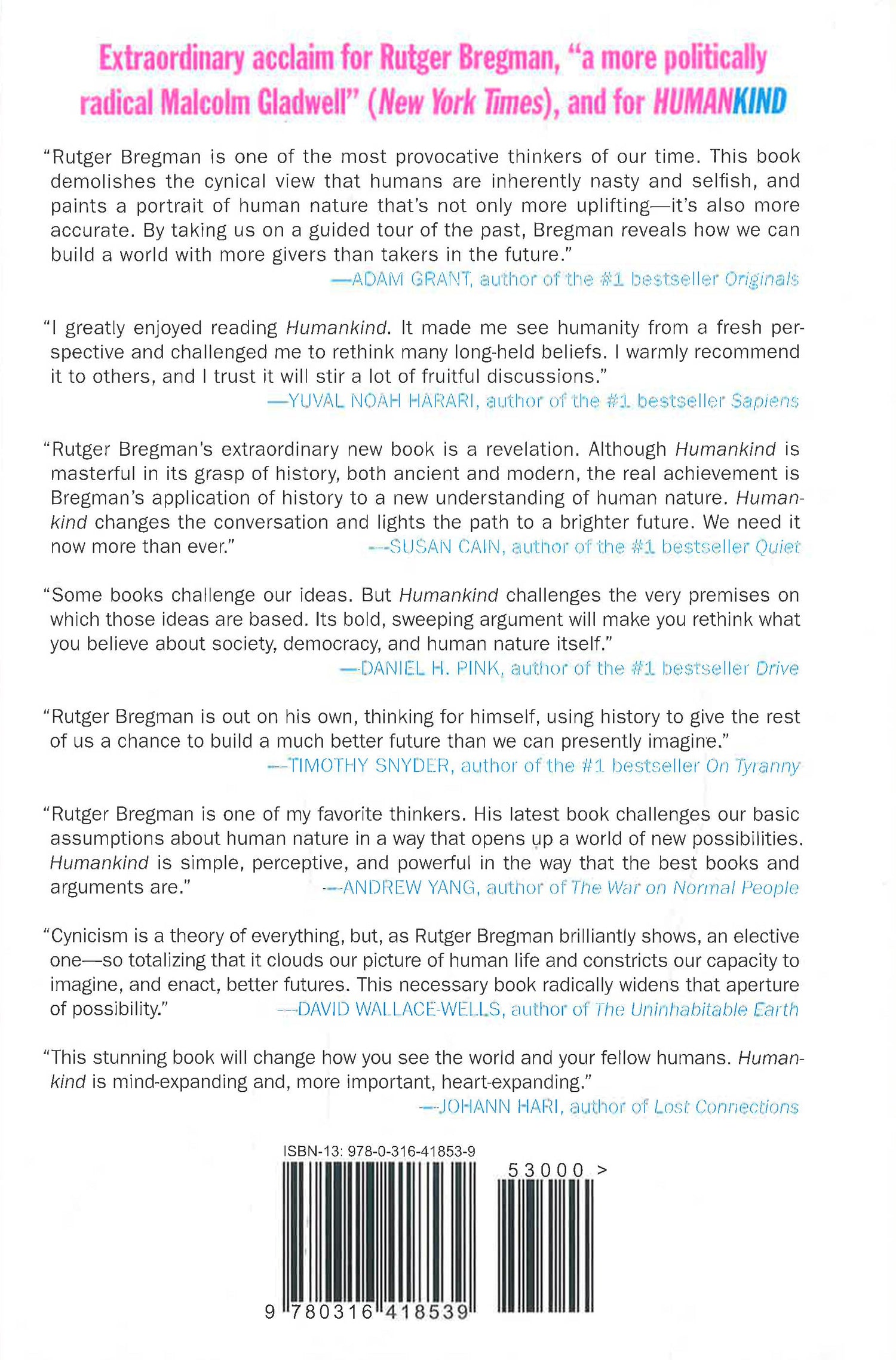 From the real-life Lord of the Flies to the solidarity in the aftermath of the Blitz, the hidden flaws in the Stanford prison experiment to the true story of twin brothers on opposite sides who helped Mandela end apartheid, Bregman shows us that believing in human generosity and collaboration isn't merely optimistic--it's realistic. Moreover, it has huge implications for how society functions. When we think the worst of people, it brings out the worst in our politics and economics. But if we believe in the reality of humanity's kindness and altruism, it will form the foundation for achieving true change in society, a case that Bregman makes convincingly with his signature wit, refreshing frankness, and memorable storytelling.