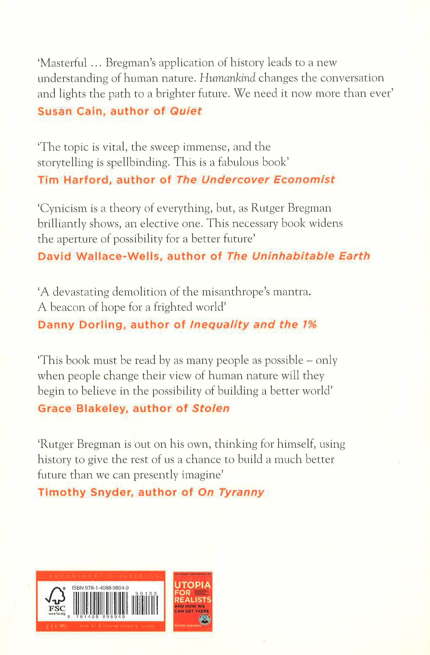 THE SUNDAY TIMES AND NEW YORK TIMES BESTSELLER A Guardian, Daily Telegraph, New Statesman and Daily Express Book of the Year 'Hugely, highly and happily recommended' Stephen Fry 'You should read Humankind. You'll learn a lot (I did) and you'll have good reason to feel better about the human race' Tim Harford 'The book we need right now' Daily Telegraph 'Made me see humanity from a fresh perspective' Yuval Noah Harari It's a belief that unites the left and right, psychologists and philosophers, writers and historians. It drives the headlines that surround us and the laws that touch our lives. From Machiavelli to Hobbes, Freud to Dawkins, the roots of this belief have sunk deep into Western thought. Human beings, we're taught, are by nature selfish and governed by self-interest. Humankind makes a new argument: that it is realistic, as well as revolutionary, to assume that people are good. The instinct to cooperate rather than compete, trust rather than distrust, has an evolutionary basis going right back to the beginning of Homo sapiens. By thinking the worst of others, we bring out the worst in our politics and economics too. In this major book, internationally bestselling author Rutger Bregman takes some of the world's most famous studies and events and reframes them, providing a new perspective on the last 200,000 years of human history. From the real-life Lord of the Flies to the Blitz, a Siberian fox farm to an infamous New York murder, Stanley Milgram's Yale shock machine to the Stanford prison experiment, Bregman shows how believing in human kindness and altruism can be a new way to think - and act as the foundation for achieving true change in our society. It is time for a new view of human nature.