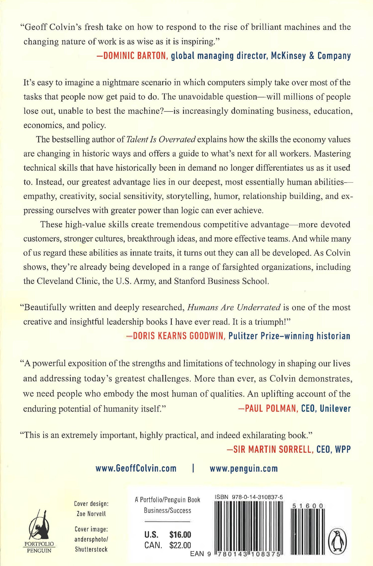 It's easy to imagine a nightmare scenario in which computers simply take over most of the tasks that people now get paid to do. The unavoidable question--will millions of people lose out, unable to best the machine?--is increasingly dominating business, education, economics, and policy. The bestselling author of Talent Is Overrated explains how the skills and economy values are changing in historic ways and offers a guide to what's next for all workers. Mastering technical skills that have historically been in demand no longer differentiates us as it used to. Instead, our greatest advantage lies in our deepest, most essentially human abilities--empathy, creativity, social sensitivity, storytelling, humor, relationship building, and expressing ourselves with greater power than logic can ever achieve. These high-value skills craete tremendous competitive advantage--more devoted customers, stronger cultures, breakthrough ideas, and more effective teams. And while many of us regard these abilities as innate traits, it turns out they can all be developed. As Colvin shows, they're already being developed in a range of farsighted organizations, including the Cleveland Clinic, the U.S. Army, and Stanford Business School. *This book may have remainder mark*