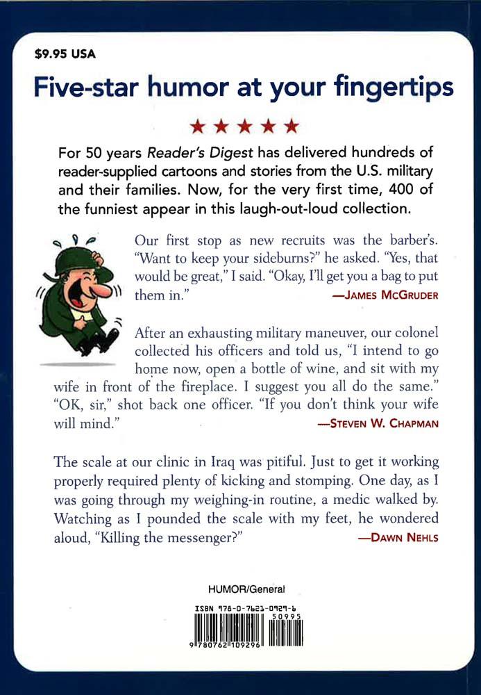 This side-splitting collection of humor delivers hundreds of the best jokes, anecdotes, cartoons, quotes, and stories from men and women in the armed forces or their families proving that life is often funnier than fiction. If laughter is the best medicine, then look no further to cure whatever ails you. The column "Offbase," formally known as "Humor in Uniform," has appeared in the Reader's Digest magazine for over half a century, and has published more than 3,500 jokes, quotes, and funny stories from the more than a million readers who have submitted them. This volume--from the world's #1 source of humor--contains laugh-out-loud gems from one of Reader's Digest's most popular columns. This side-splitting collection of humor delivers hundreds of the best jokes, anecdotes, cartoons, quotes, and stories from men and women in the armed forces or their families proving that life is often funnier than fiction. Such as: - From a Family Member: My son regaled me with stories about how they do things in the modern Air Force. Being an old Air Force man myself, I scoffed at their complicated methods. "That's not the way we did it when I was in the service," I said. "Yeah," he shot back. "But when you were in, there were only two pilots, Wilbur and Orville" -- Ted Shirley - From an Army Soldier: Our Army Unit was overseas conducting maneuvers with the Marines. On shift one night, a Marine asked my sergeant where he was from. "I'm originally from Central America," said the sergeant. "Oh, yeah?" asked the Marine. "Kansas?" -- David Denbek - From Iraq: At the end of a tough day in Iraq, my daughter, the airman, collapsed onto the first seat in the transport truck, forcing everyone else to climb over her. "Private!" hollered the sergeant, "Skinny girls get in the back so when we men get on with our weapons and equipment, we don't have to climb over you. Have I made myself clear?" Suddenly my daughter perked up, "Do you really think I'm skinny?" -- Margaret Culbertson - About the Military: A soldier stationed at Fort Bliss, Texas, actually got a letter addressed to "Fort Ignorance." "How did you know where to deliver it?" she asked the mailman. "We were stumped at first," he admitted. "But then I remembered, ignorance is bliss." -- William De Graf For yourself, a friend, or family member--what could be better than the gift of laughter?