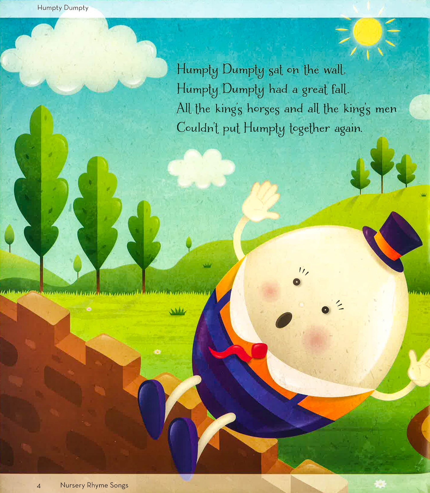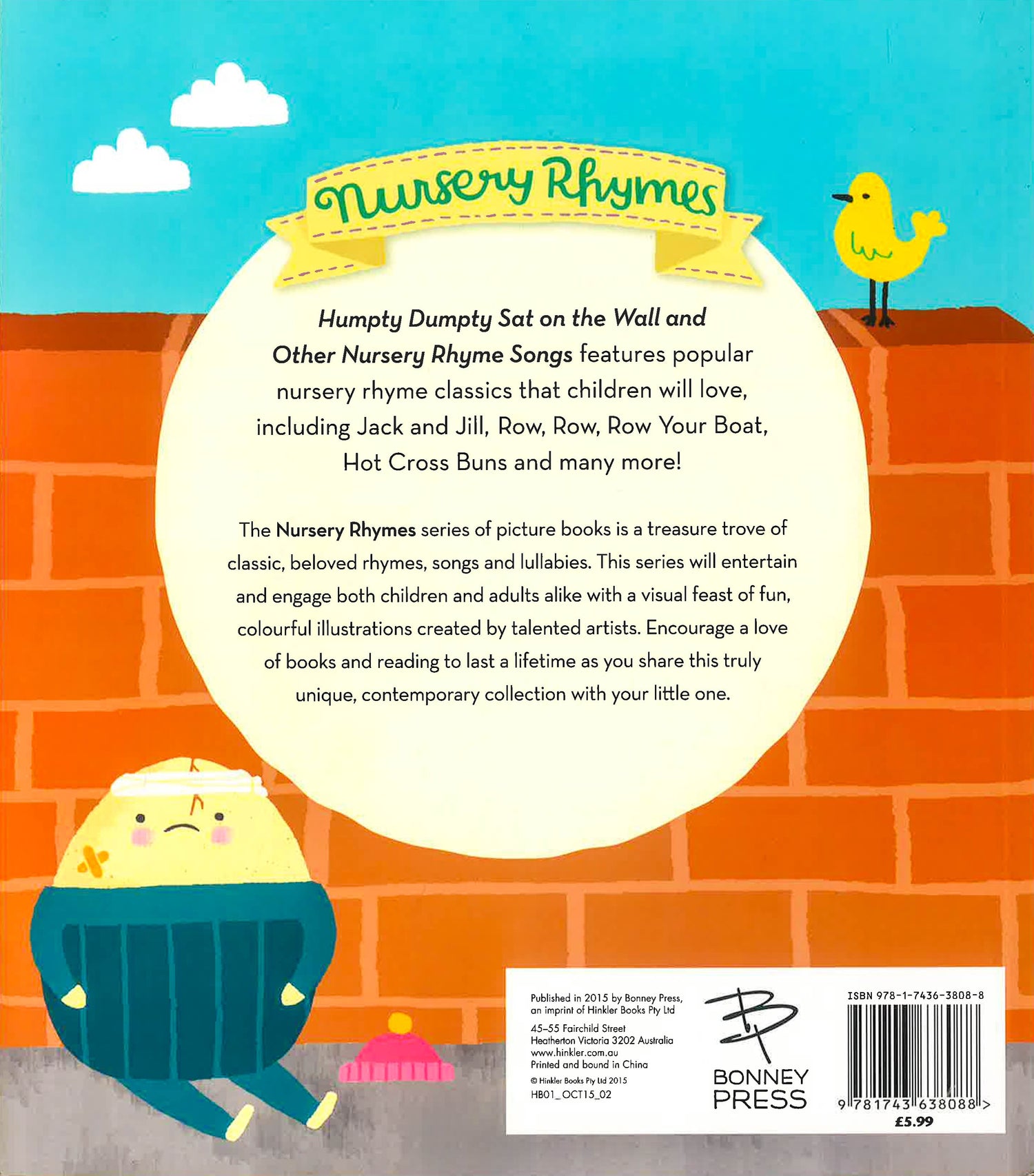 Humpty Dumpty Sat on the Wall and Other Nursery Rhyme Songs features popular nursery rhyme classics that children will love, including Jack and Jill, Row, Row, Row Your Boat, Hot Cross Buns and many more! The Nursery Rhymes series of picture books is a treasure trove of classic, beloved rhymes, songs and lullabies. This series will entertain and engage both children and adults alike with a visual feast of fun, colourful illustrations created by talented artists. Encourage a love of books and reading to last a lifetime as you share this truly unique, contemporary collection with your little one.