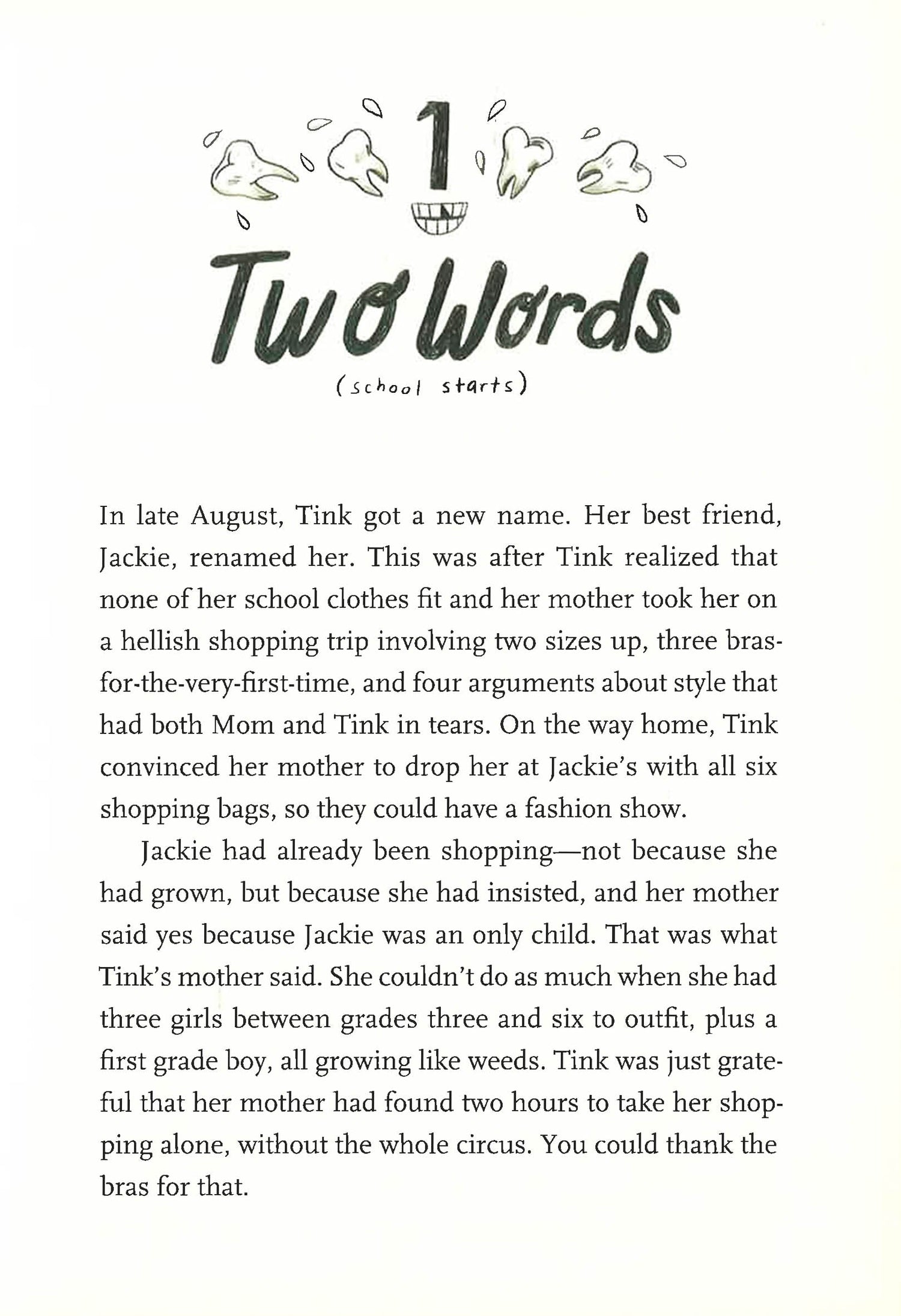 The last year of elementary school is big for every kid. In this novel, equal parts funny and crushing, utterly honest and perfect for boys and girls alike, Christine Gouda faces change at every turn, starting with her own nickname-Tink-which just doesn't fit anymore. Readers will relate to this strong female protagonist whose voice rings with profound authenticity and absolute novelty, and her year's cringingly painful trials in normalcy-uncomfortable Halloween costumes, premature sleepover parties, crushed crushes, and changing friendships. Throughout all this, Tink learns, what you call yourself, and how you do it, has a lot to do with who you are. This book marks beloved author Karen Romano Young's masterful return to children's literature: a heartbreakingly honest account of what it means to be between girl and woman, elementary and middle school, inside and out-and just what you name that in-between self.