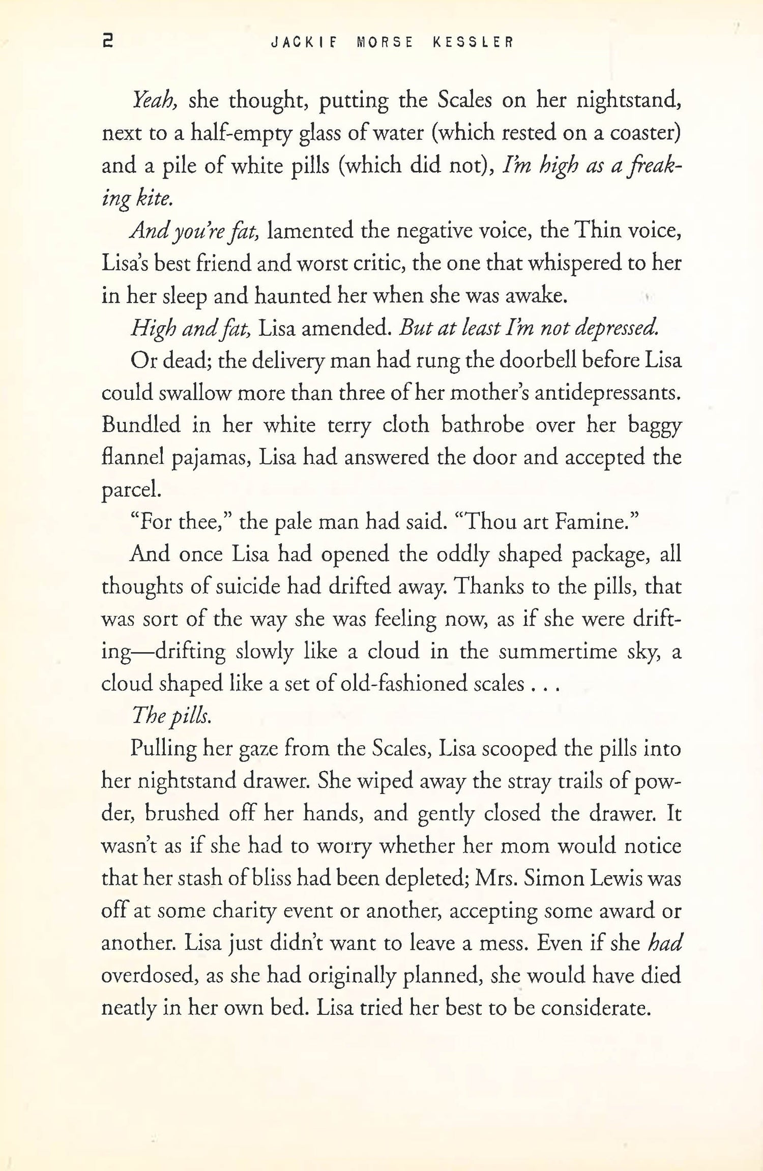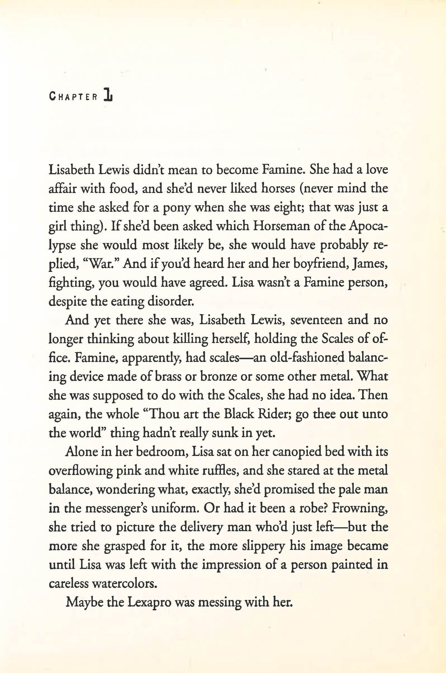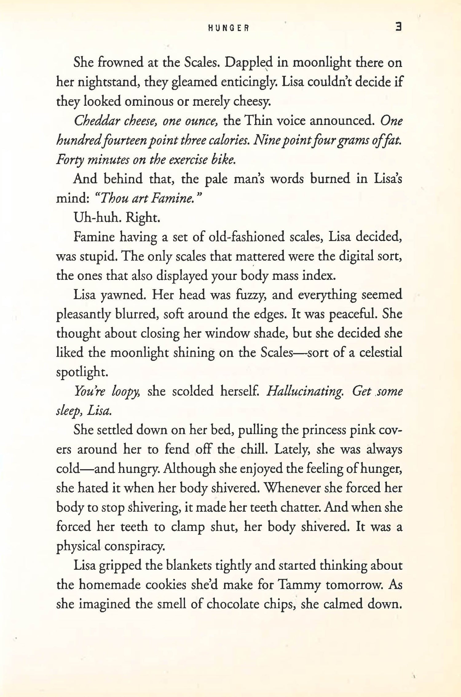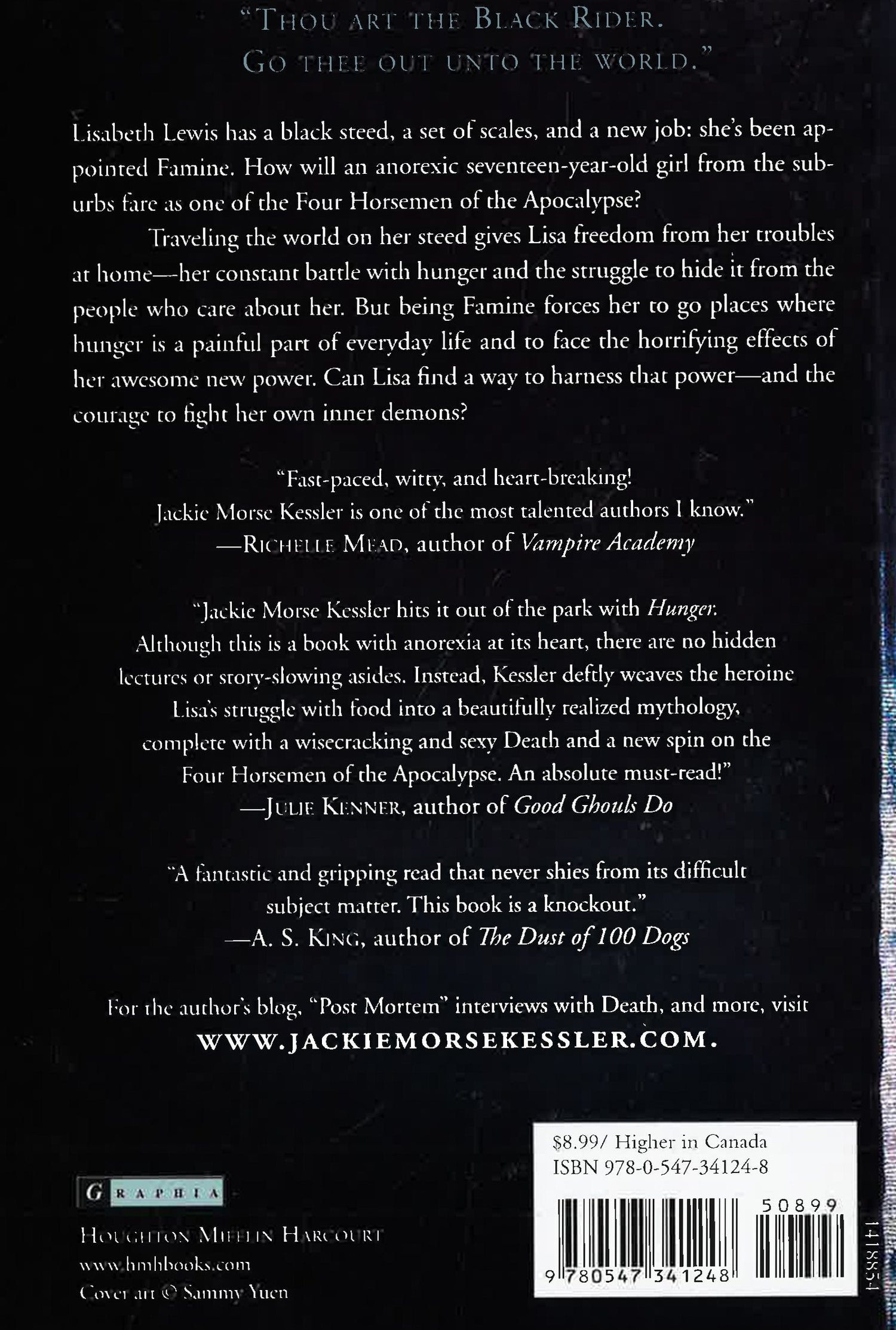 "Thou art the Black Rider. Go thee out unto the world." Lisabeth Lewis has a black steed, a set of scales, and a new job: she's been appointed Famine. How will an anorexic seventeen-year-old girl from the suburbs fare as one of the Four Horsemen of the Apocalypse? Traveling the world on her steed gives Lisa freedom from her troubles at home--her constant battle with hunger, and her struggle to hide it from the people who care about her. But being Famine forces her to go places where hunger is a painful part of everyday life, and to face the horrifying effects of her phenomenal power. Can Lisa find a way to harness that power--and the courage to fight her own inner demons? A wildly original approach to the issue of eating disorders, Hunger is about the struggle to find balance in a world of extremes, and uses fantastic tropes to explore a difficult topic that touches the lives of many teens.