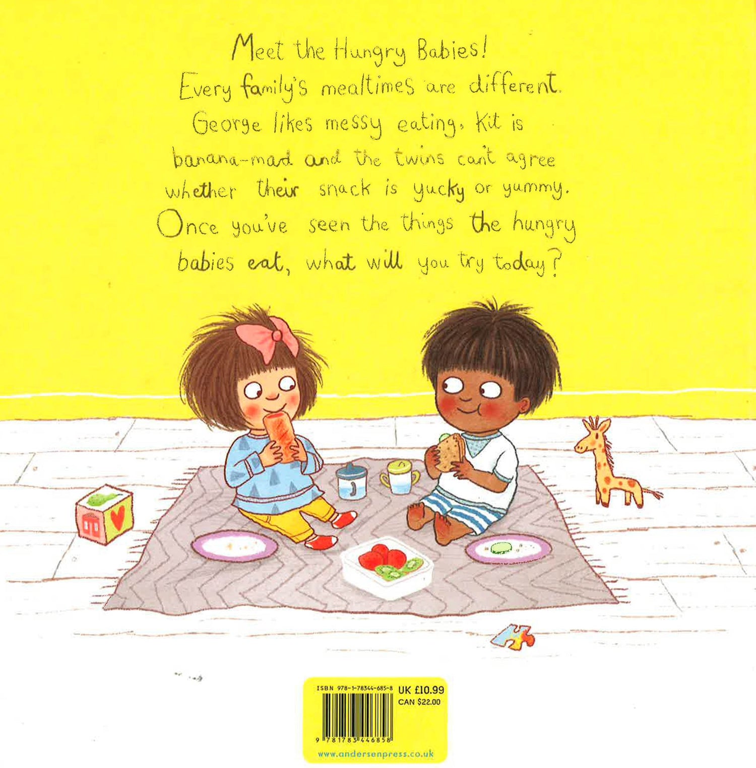 Fearne Cotton's yoga-loving tots are back, and this time they're hungry! Every family's mealtimes are different. George likes messy eating, Kit is banana-mad and the twins can't agree whether their snack is yucky or yummy. From chaotic breakfasts to birthday parties, Fearne Cotton's adorable Hungry Babies love to have fun at mealtimes.