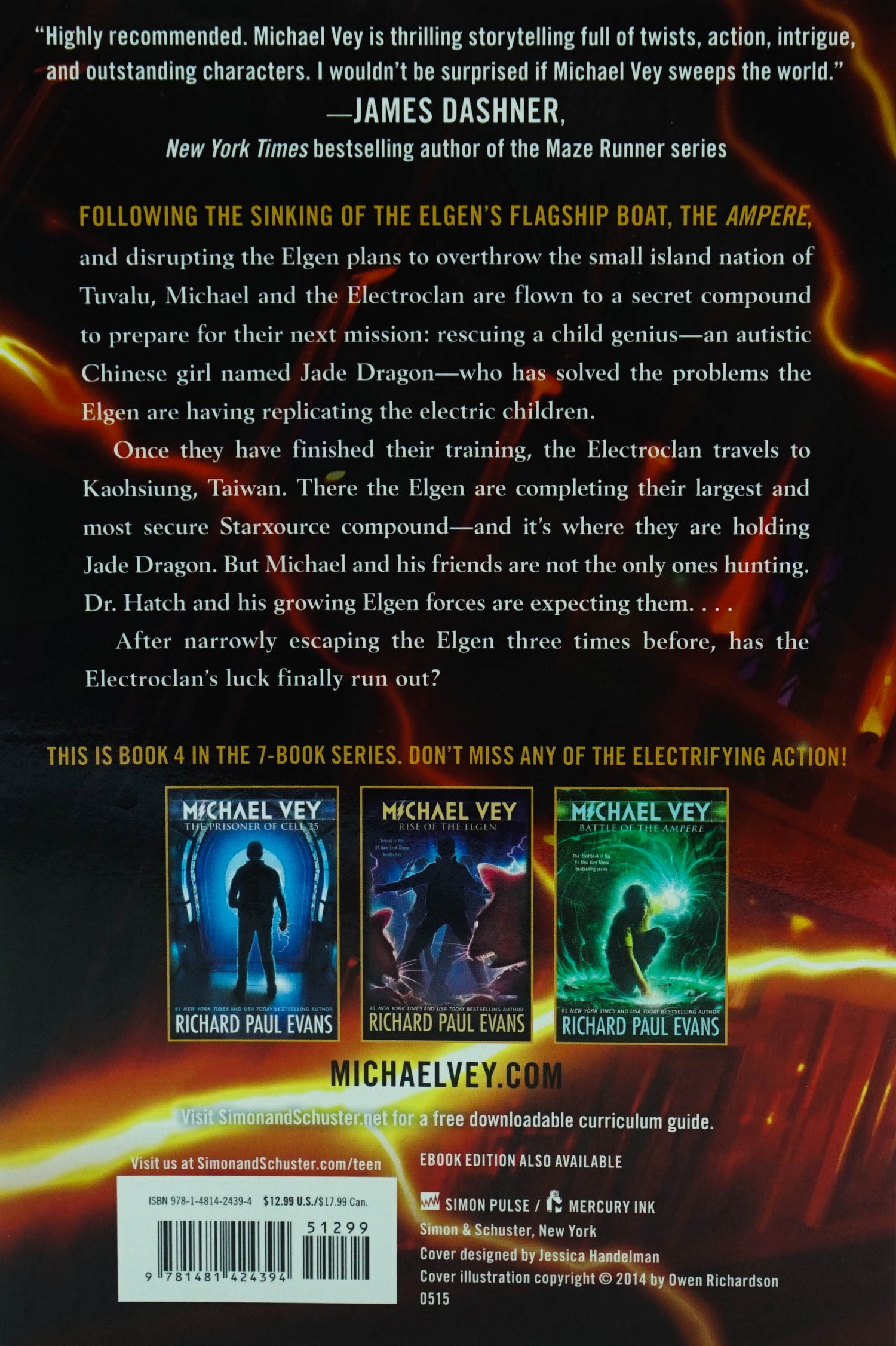 Michael and his friends must rescue a child prodigy as the thrilling action continues in this electrifying fourth installment of the "New York Times "bestselling series! Michael, Taylor, Ostin and the rest of the Electroclan head to China in search of a girl who may have discovered why Michael and his friends became electric. Her name is Lin Julung, or Jade Dragon, and she s a child prodigy with an IQ higher than Einstein s "and" Ostin s. But Hatch gets to her first, and the Elgen are holding her prisoner in their Taiwan Starxource plant. Now the Voice wants Michael and the Electroclan to go to Taiwan and free her before Hatch can realize his dreams of an army of electric children. The hunt for Jade Dragon is on, and it s a race against time!