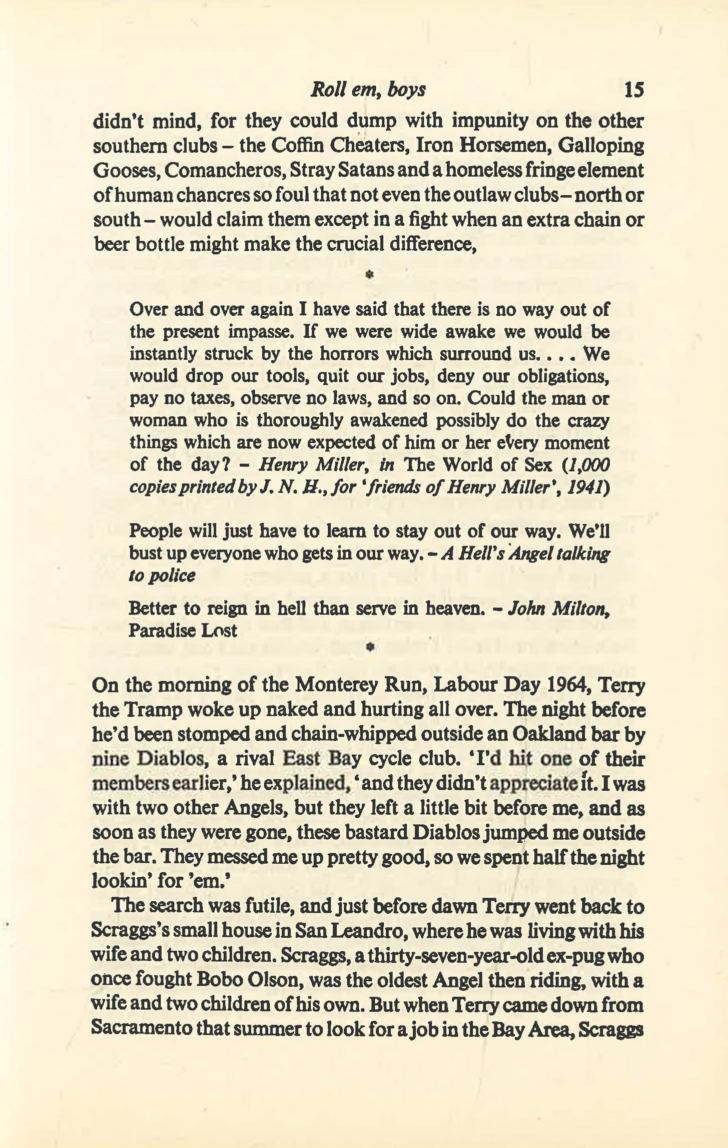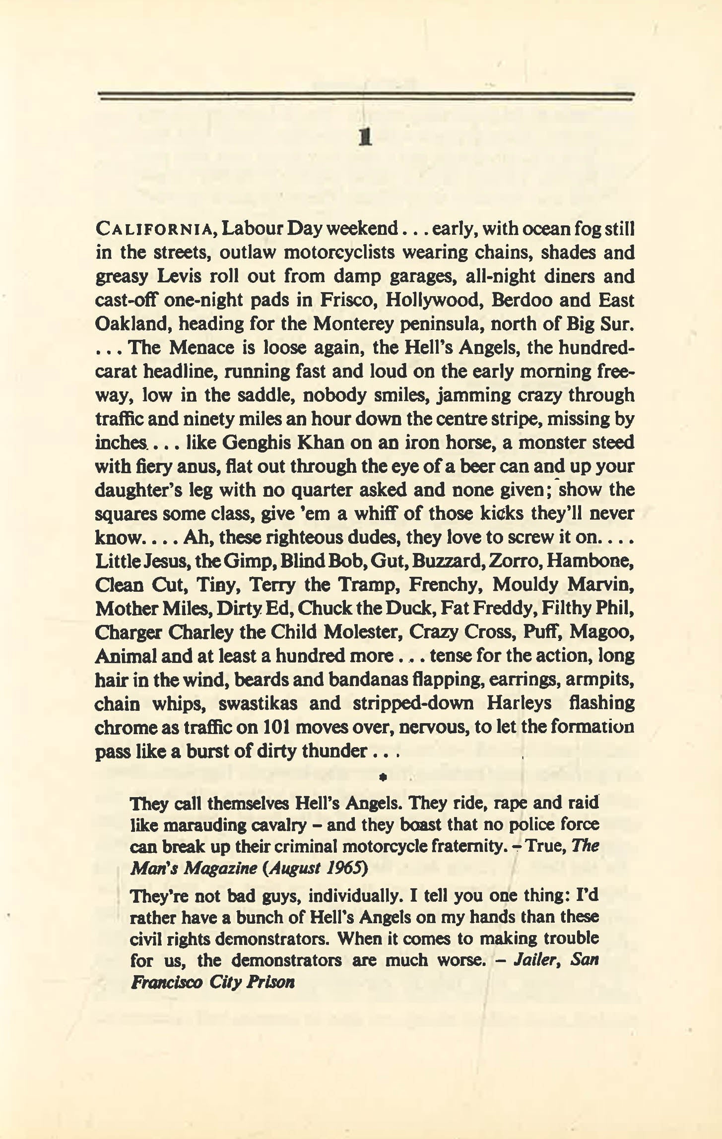 A phalanx of motorcycles came roaring over the hill from the west... the noise was like a landslide, or a wing of bombers passing over. Even knowing the Angels I couldn't quite handle what I was seeing. It was like Genghis Khan, Morgan's Raiders, the Wild One and the Rape of Nanking all at once.' In September, 1964 a cavalcade of motorbikes ripped through the city of Monterey, California. It was a trip destined to make Hell's Angels household names across America, infamous for their violent, drunken rampages and feared for the destruction left in their wake. Enter Hunter S. Thompson, the master of counter-culture journalism who alone had the ability and stature to ride with the Angels on their terms. In this brilliant and hair-raising expose, he journeys with the last outlaws of the American frontier. A mixture of journalism, story-telling and sheer bravado, Hell's Angels is Hunter S. Thompson at full throttle.