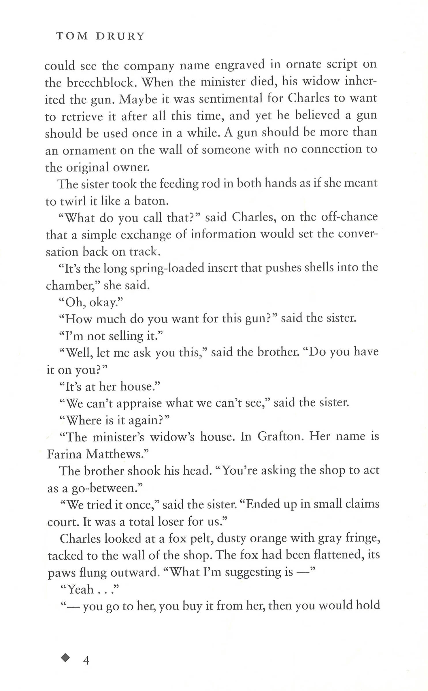 In this mesmerizing novel, Tom Drury once again journeys to the quiet Midwest to spend an action-packed October weekend in the lives of a precarious family whose members all want something without knowing how to get it: for Charles, an heirloom shotgun; for his wife, Joan, the imaginative life she once knew; for their young son, Micah, a knowledge of the scope and reliability of his world, aided by prowling the empty town at night; and for Joan's daughter, Lyris, a stable foot from which to begin to grow up.