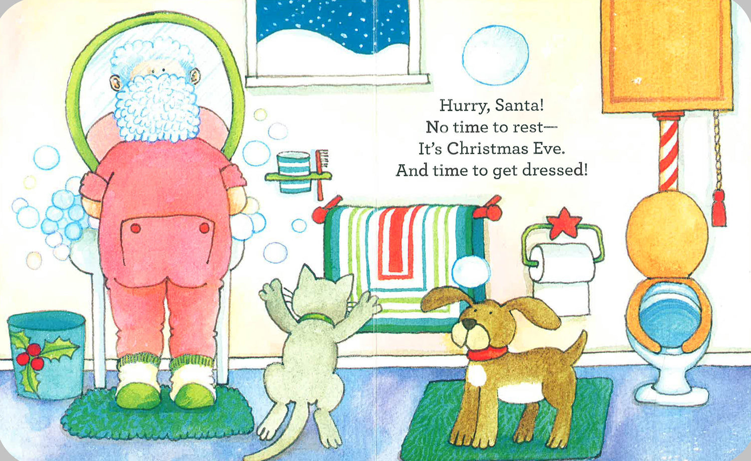 Hurry, Santa! No time to rest, It’s Christmas Eve. And time to get dressed!
