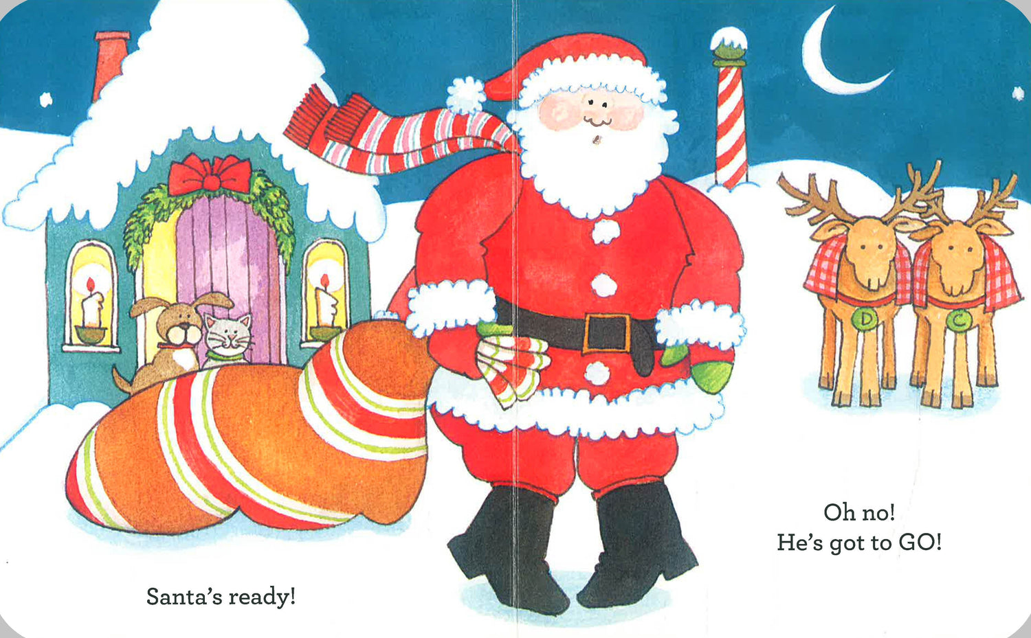 It’s finally time for Santa to prepare for the most magical night of the year! But before he can spread Christmas cheer to every boy and girl, he must hurry up and get ready. Just when he’s almost out the door, Santa runs back inside because OH NO! Santa’s got to GO!
