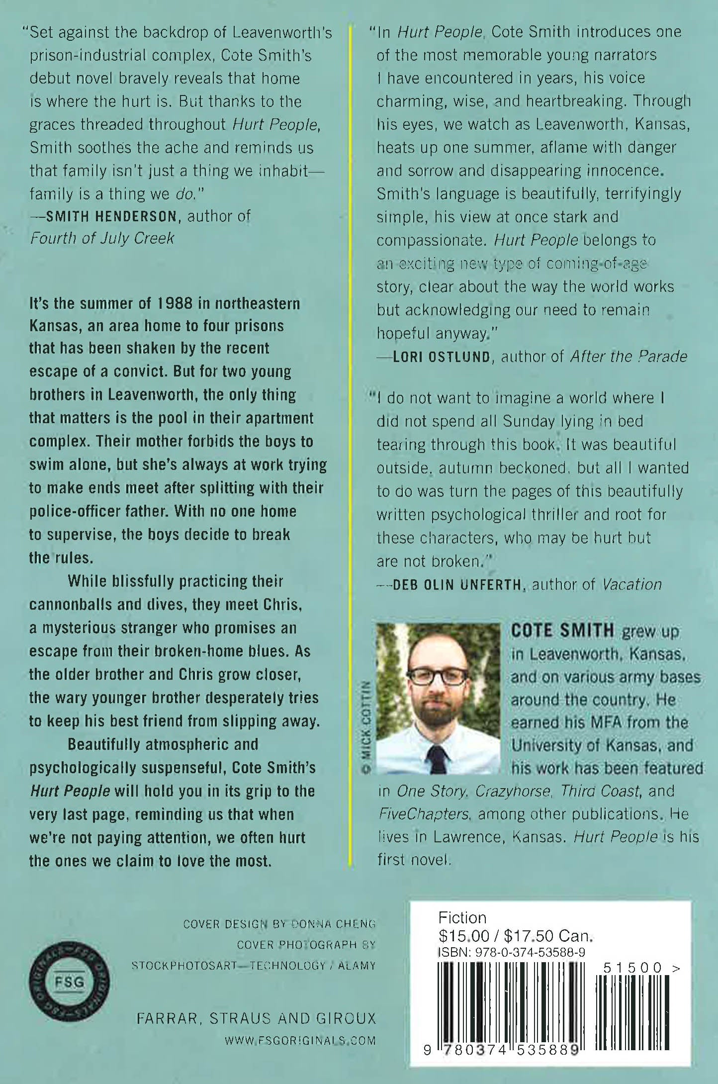 It’s the summer of 1988 in northeastern Kansas, an area home to four prisons that has been shaken by the recent escape of a convict. But for two young brothers in Leavenworth, the only thing that matters is the pool in their apartment complex. Their mother forbids the boys to swim alone, but she’s always at work trying to make ends meet after splitting with their police-officer father. With no one home to supervise, the boys decide to break the rules.While blissfully practicing their cannonballs and dives, they meet Chris, a mysterious stranger who promises an escape from their broken-home blues. As the older brother and Chris grow closer, the wary younger brother desperately tries to keep his best friend from slipping away.Beautifully atmospheric and psychologically suspenseful, Cote Smith’s Hurt People will hold you in its grip to the very last page, reminding us that when we’re not paying attention, we often hurt the ones we claim to love the most.