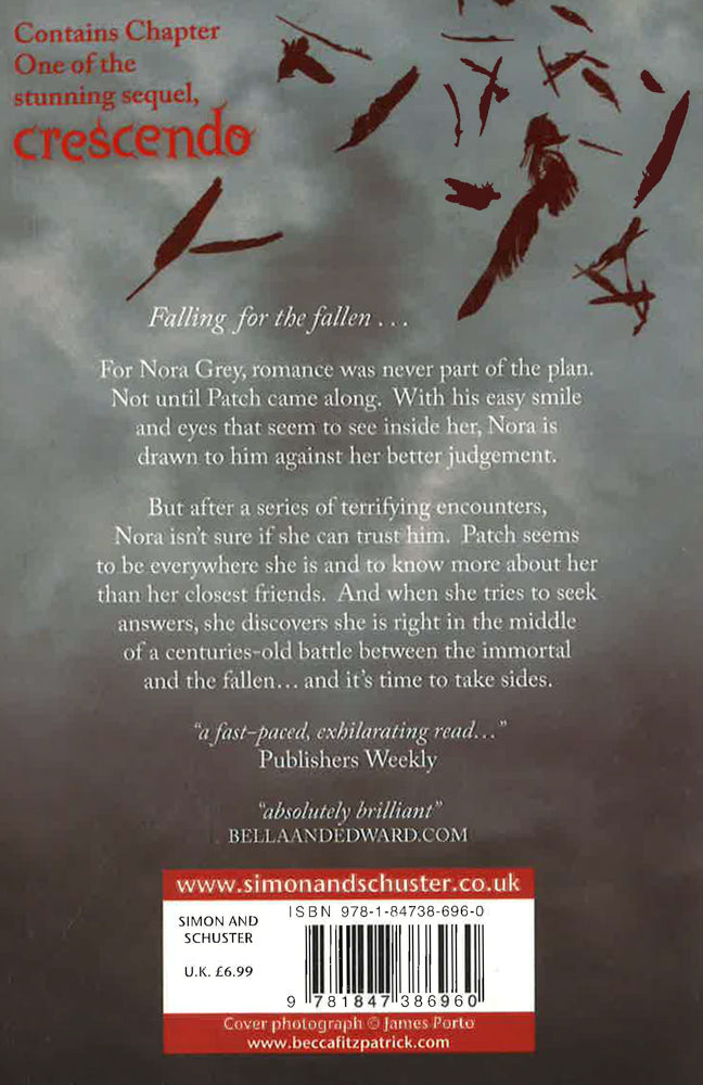 Nora Grey is responsible and smart and not inclined to be reckless. Her first mistake was falling for Patch. Patch has made countless mistakes and has a past that could be called anything but harmless. The best thing he ever did was fall for Nora. After getting paired together in biology, all Nora wants to do is stay away from Patch, but he always seems to be two steps ahead of her. She can feel his eyes on her even when he is nowhere around. She feels him nearby even when she is alone in her bedroom. And when her attraction can be denied no longer, she learns the secret about who Patch is and what led him to her, as well as the dark path he is about to lead her down. Despite all the questions she has about his past, in the end, there may be only one question they can ask each other: How far are you willing to fall?