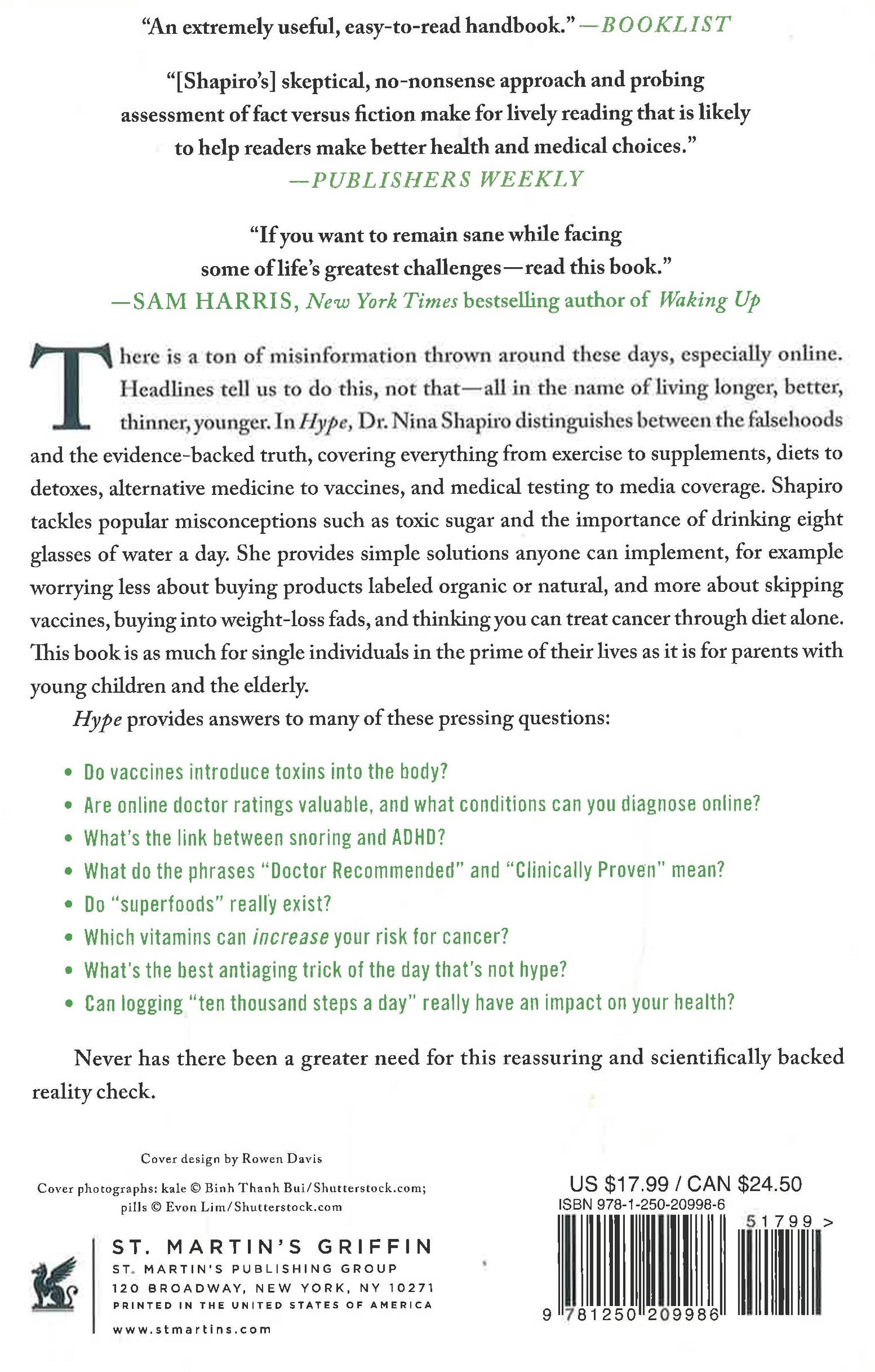Hype covers everything from exercise to supplements, diets to detoxes, alternative medicine to vaccines, and medical testing to media coverage. Shapiro tackles popular misconceptions such as toxic sugar and the importance of drinking eight glasses of water a day. She provides simple solutions anyone can implement, such as worrying less about buying products labeled organic or natural, and more about skipping vaccines, buying into weight-loss fads, and thinking you can treat cancer through diet alone. This book is as much for single individuals in the prime of their lives as it is for parents with young children and the elderly.